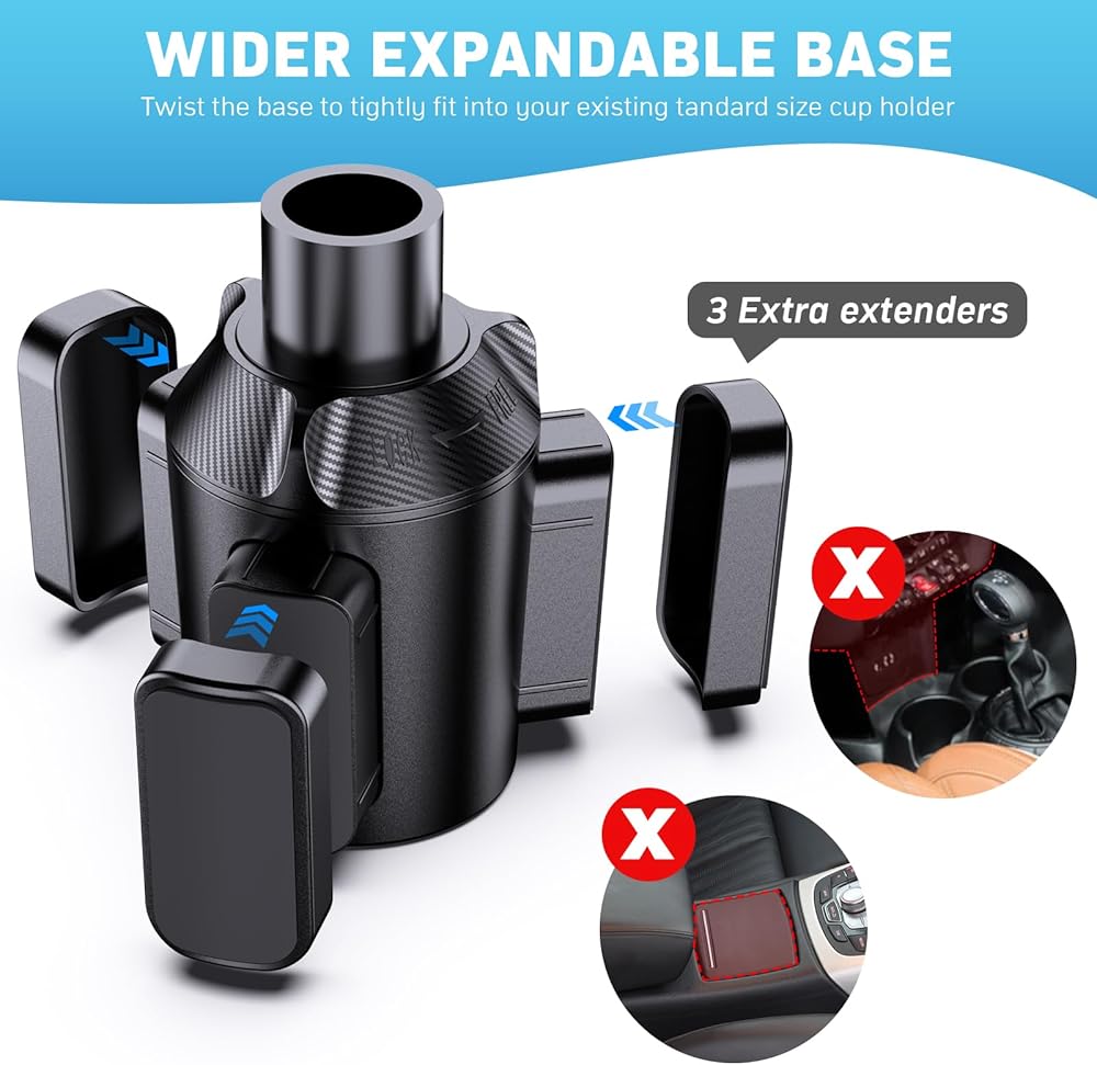 [قاعدة قابلة للتوسيع] - تناسب معظم حاملات الأكواب المستديرة بقطر من 2.6 إلى 3.7 بوصة؛ يتميز بخيار تركيب أوفست يسمح للحامل بالجلوس بعيدًا عن المركز لتجنب العوائق مثل وحدات التحكم المركزية، ومبدلات التروس، ومكابح الطوارئ، وحاملات الأكواب الثانوية؛ مقبض بمقبض مرتفع لسهولة وراحة شد موسع حامل الأكواب للسيارة. يضيف الثبات إلى حامل الأكواب القابل للتوسيع للسيارة.