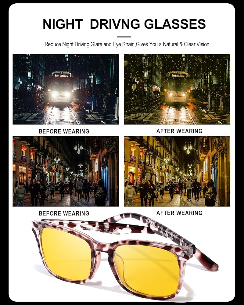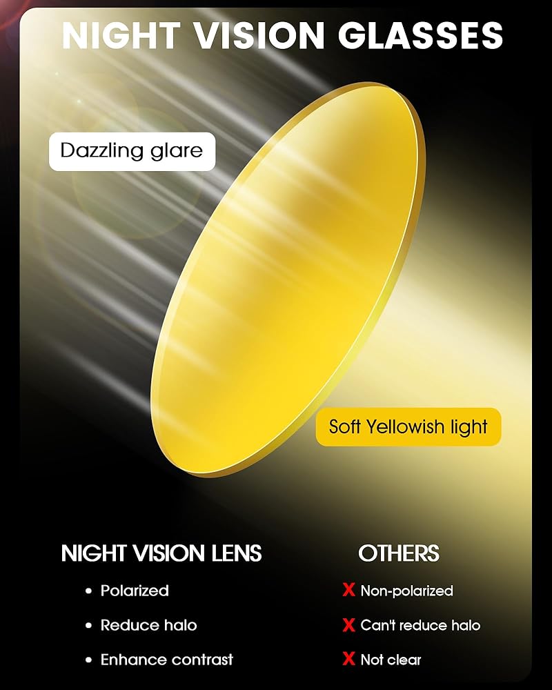 نظارات القيادة الليلية: حافظ على سلامتك أثناء القيادة ليلاً مع نظارات الرؤية الليلية الخاصة بنا. تعمل عدساتنا الصفراء المستقطبة على تقليل الوهج الناتج عن حركة المرور القادمة، مما يسمح لك برؤية كل شيء على الطريق وتساعد على الحفاظ على سلامتك وسلامة الآخرين. كما توفر العدسات الصفراء رؤية واضحة ونقية، حتى في ظروف الإضاءة المنخفضة