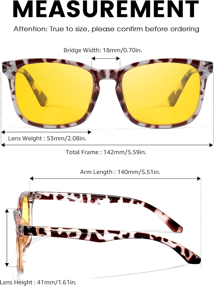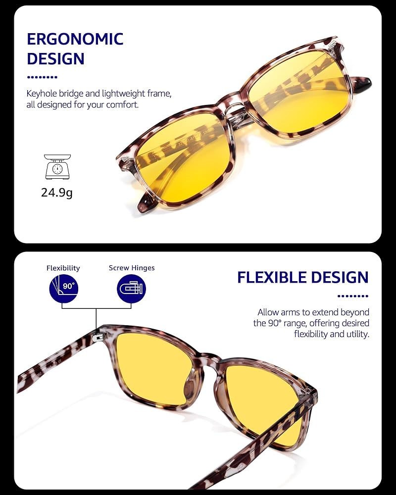 تصميم مريح: تم تصميم نظارتنا بمواد بلاستيكية فاخرة تجعلها خفيفة الوزن ومريحة في الارتداء. تضمن وسادات الأنف المكونة من قطعة واحدة في النظارة الليلية بقاء أنفك وأذنيك مرتاحين طوال اليوم، كما أن الشكل المربع للنظارة يعني أنها لن تضغط على شعرك عند وضعها على رأسك.