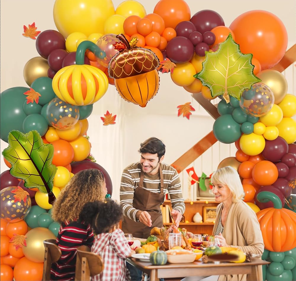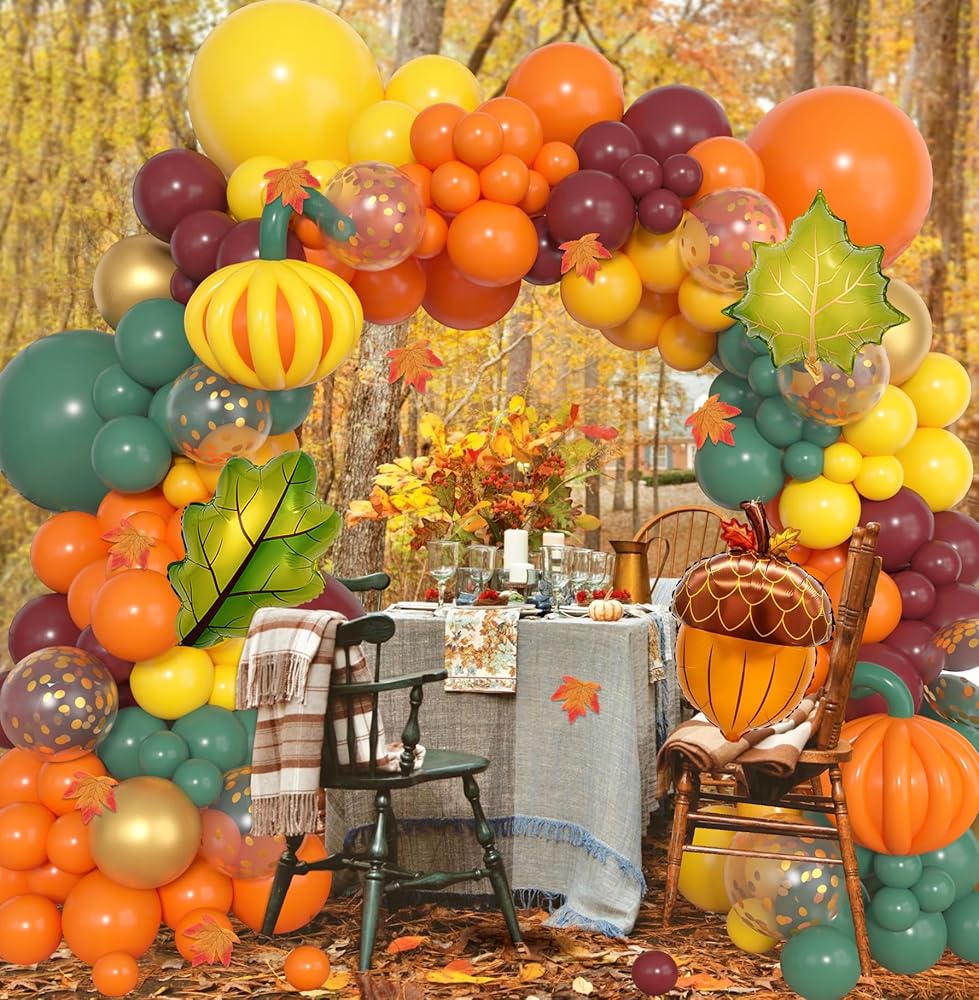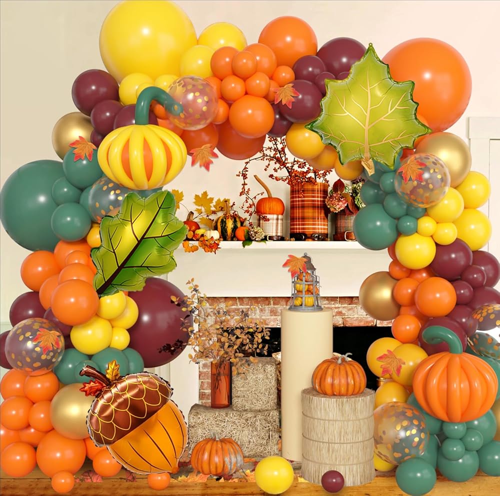 Ouddy Life 196 قطعة من بالونات الخريف مجموعة إكليل القوس، ديكورات حفلات الخريف برتقالي أخضر أصفر بورجوندي أوراق القيقب الصنوبر لأصدقاء الخريف وعيد الشكر الصغير على شكل يقطين ديكور حمام الطفل