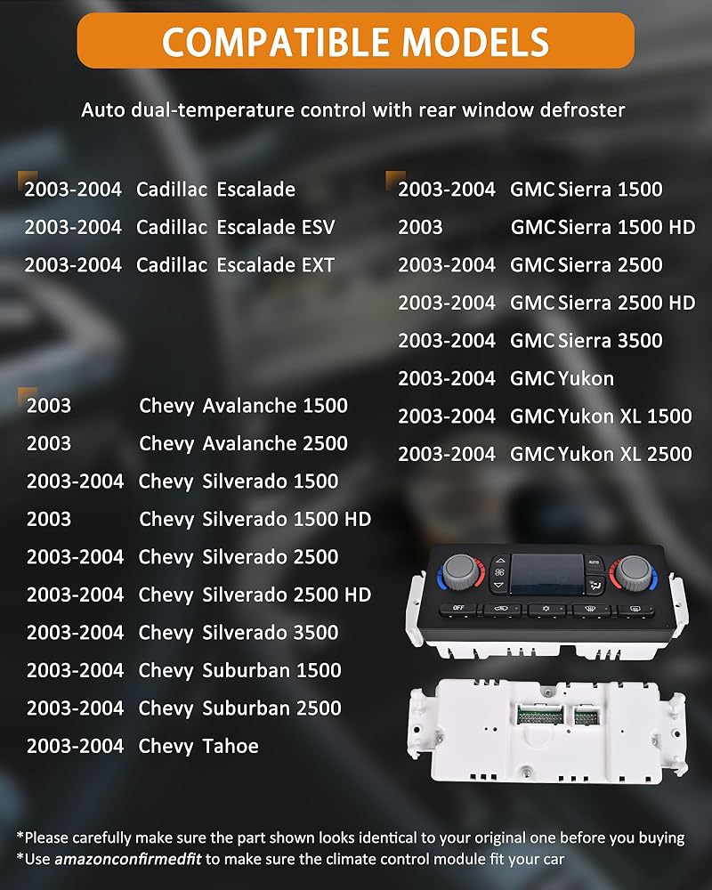 لسلسلة جي إم سي: وحدة التحكم في المناخ متوافقة مع جي إم سي 2003-2004 سييرا 1500، 2003 سييرا 1500HD، 2003-2004 سييرا 2500 سييرا 2500HD، 2003-2004 سييرا 3500، 2003-2004 يوكون، 2003-2004 يوكون XL 1500، 2003-2 004 يوكون اكس ال 2500