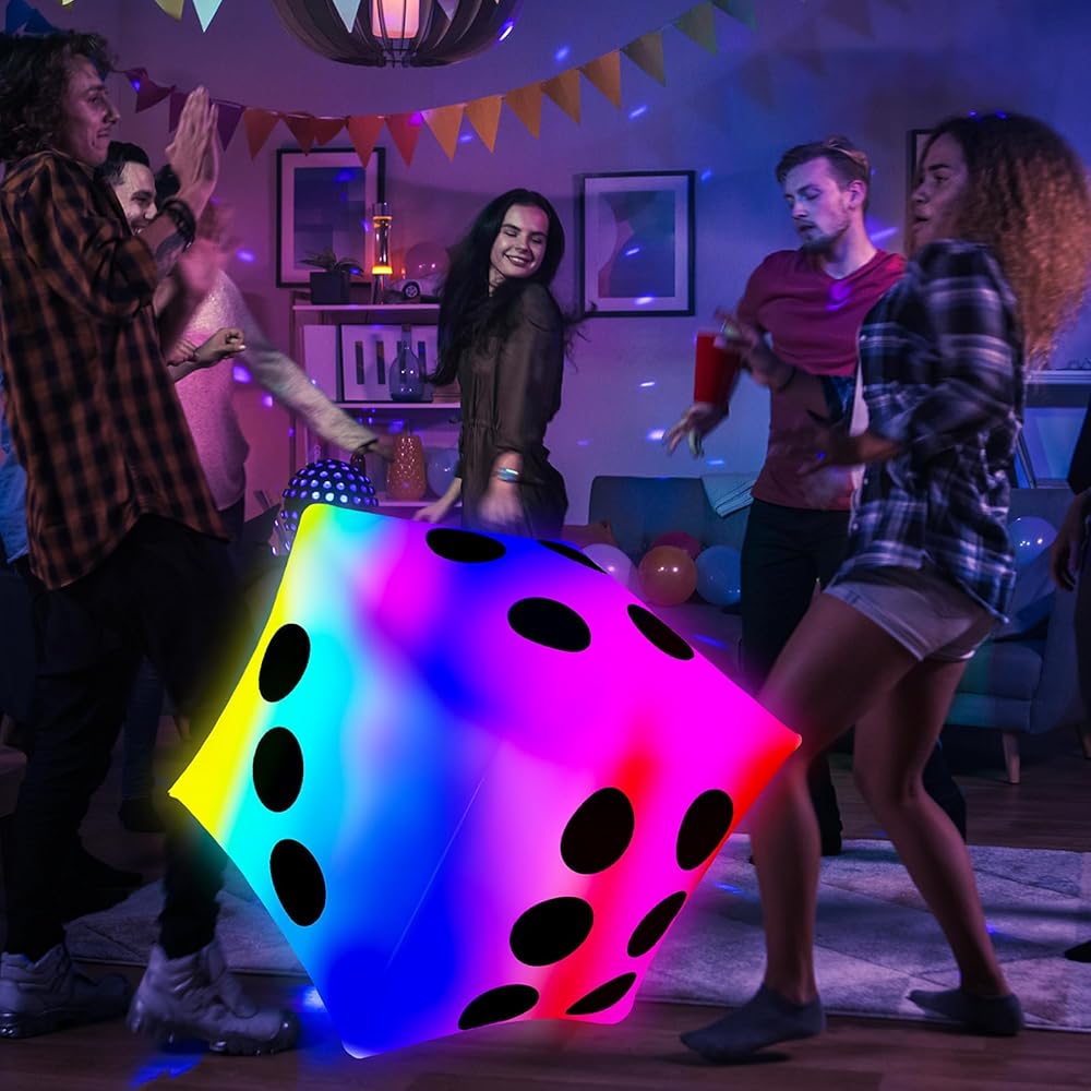 LED Light up Feature: the 2 piece light up inflatable dice not only boast a versatile white with black dots scheme, but also come fitted with an LED button battery(included); You just need to slap the dice, and it will light up; The glittering LED lights make these dice an attractive choice for evening activities or night parties, adding illuminating fun to the traditional dice activity