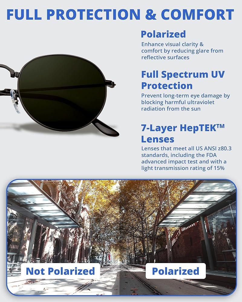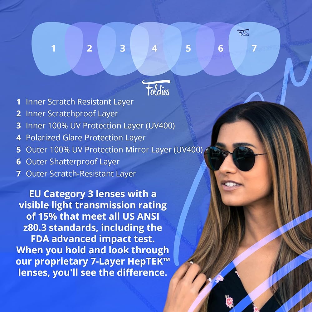 عدسات HepTEK المستقطبة ذات 7 طبقات لكل مناسبة - تتميز نظارتنا الشمسية القابلة للطي بعدسات HepTEK المستقطبة ذات 7 طبقات، مما يوفر حماية كاملة من الأشعة فوق البنفسجية بنسبة 100%، بما في ذلك الأشعة فوق البنفسجية فئة A وB وUV400. كما أن العدسات مقاومة للخدش، مما يضمن وضوحًا ومتانة تدوم طويلاً.
