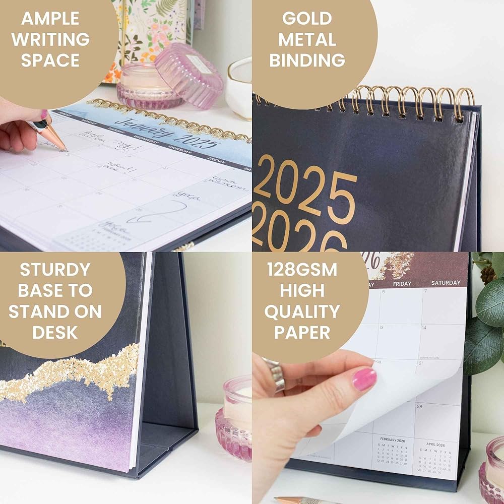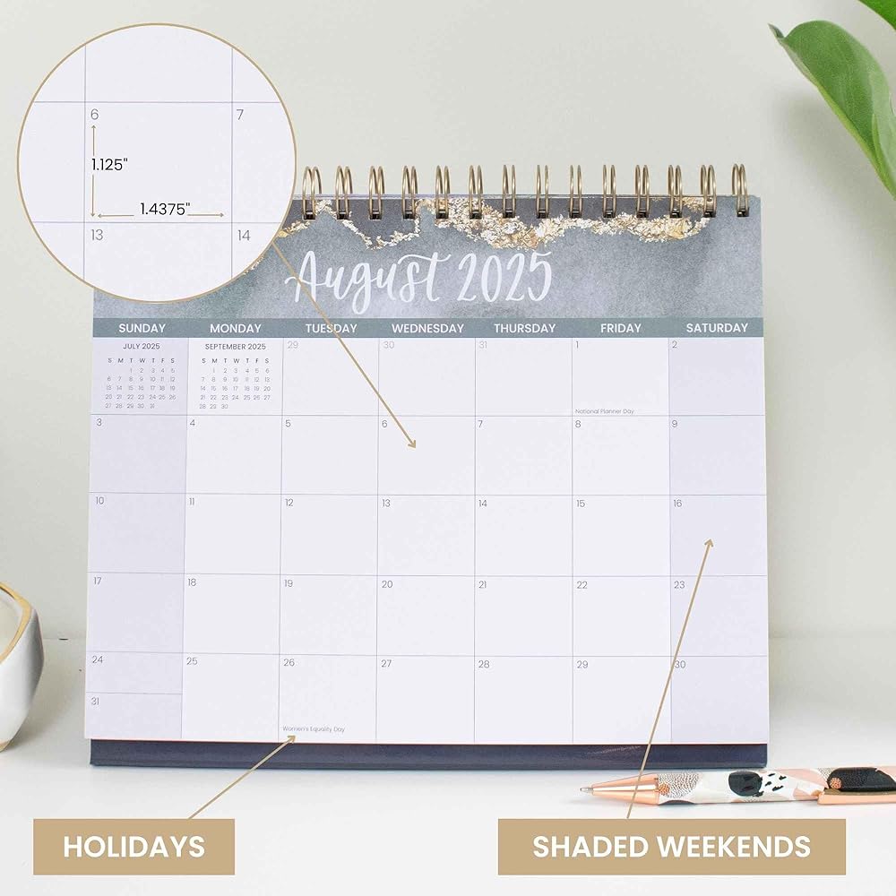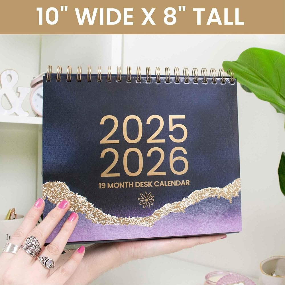 الأبعاد: 10 بوصة عرض × 8 بوصة طول تقويم قلاب. الحجم المثالي لتصور جدولك الزمني بسرعة دون شغل مساحة كبيرة في منزلك أو مكتبك، ولكنه كبير بما يكفي للملاحظات والأفكار والاجتماعات والمواعيد والذكرى السنوية والمناسبات.