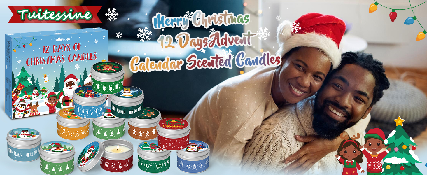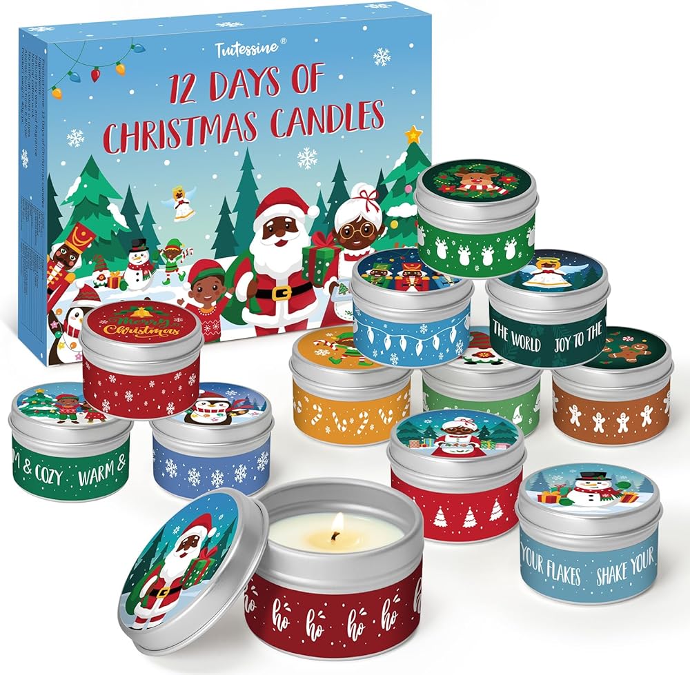 Tuitessine 12 يومًا تقويم قدوم عيد الميلاد 2024 شموع معطرة زينة عيد الميلاد الأمريكية الأفريقية شموع جرة شمع الصويا 12 قطعة تقويم عيد الميلاد العد التنازلي هدايا سانتا كلوز السوداء
