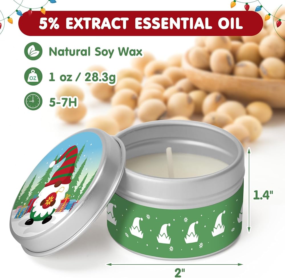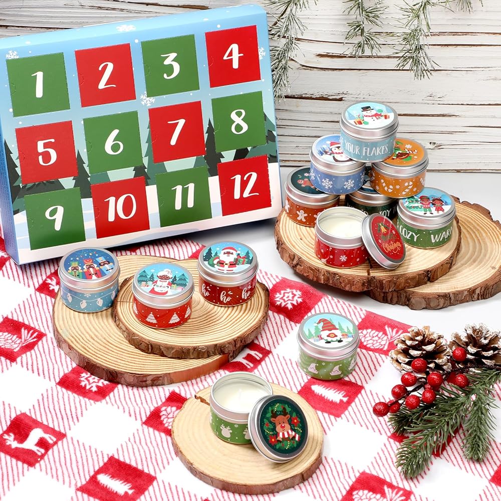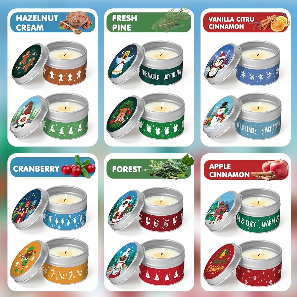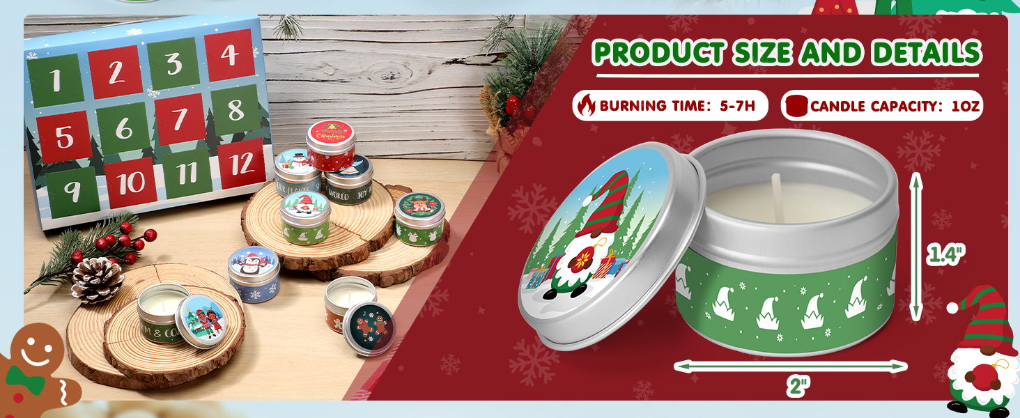 مجموعة شموع عيد الميلاد المكونة من 12 قطعة: سوف تحصل على صندوق هدايا عيد الميلاد يحتوي على 12 بابًا مثقوبًا، والتي تحتوي على 12 شمعة مختلفة. يحتوي صندوق الشموع هذا على 6 عطور مختلفة لعيد الميلاد: الغابة، كريم البندق، التوت البري، الصنوبر الطازج، الفانيليا، القرفة الحمضية، وقرفة التفاح.