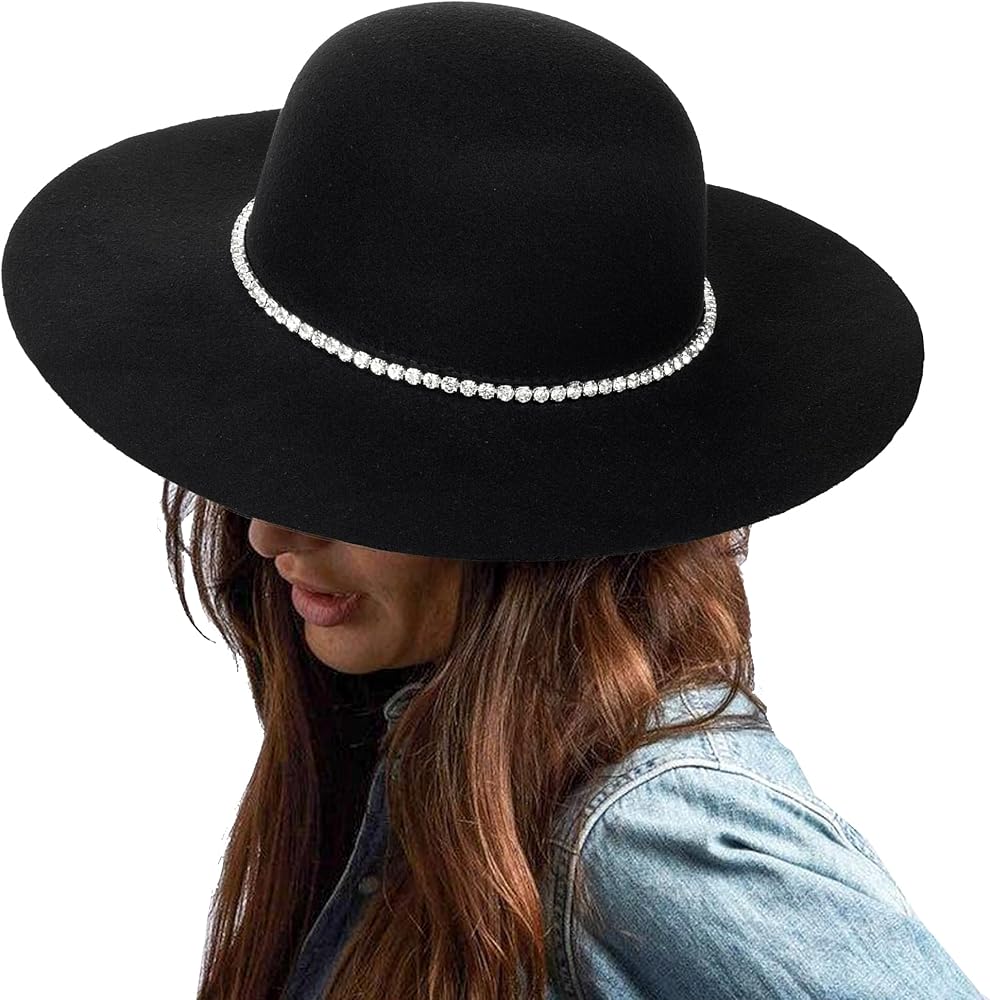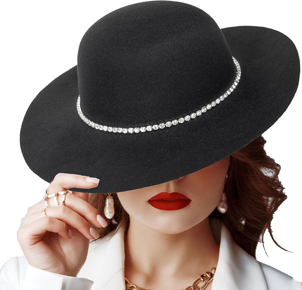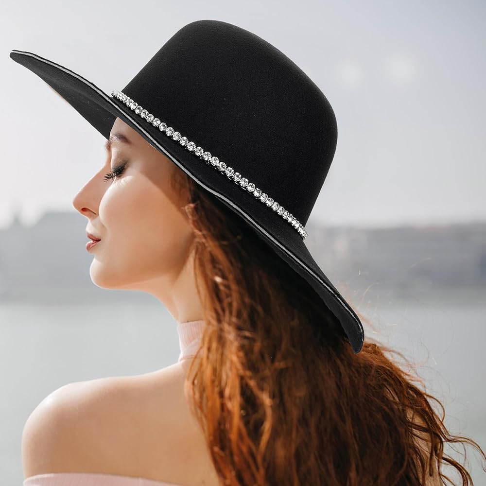 قبعة فيدورا باللون الأسود مع حجر الراين: لباد ناعم ولها ملمس جيد. يتميز القماش بسُمك جيد، مما يحافظ على شكل القبعة المرنة. مما يجعل القبعة المرنة عصرية وأنيقة. إنها إكسسوارات شتوية مثالية للنساء لتناسب معطفهن.