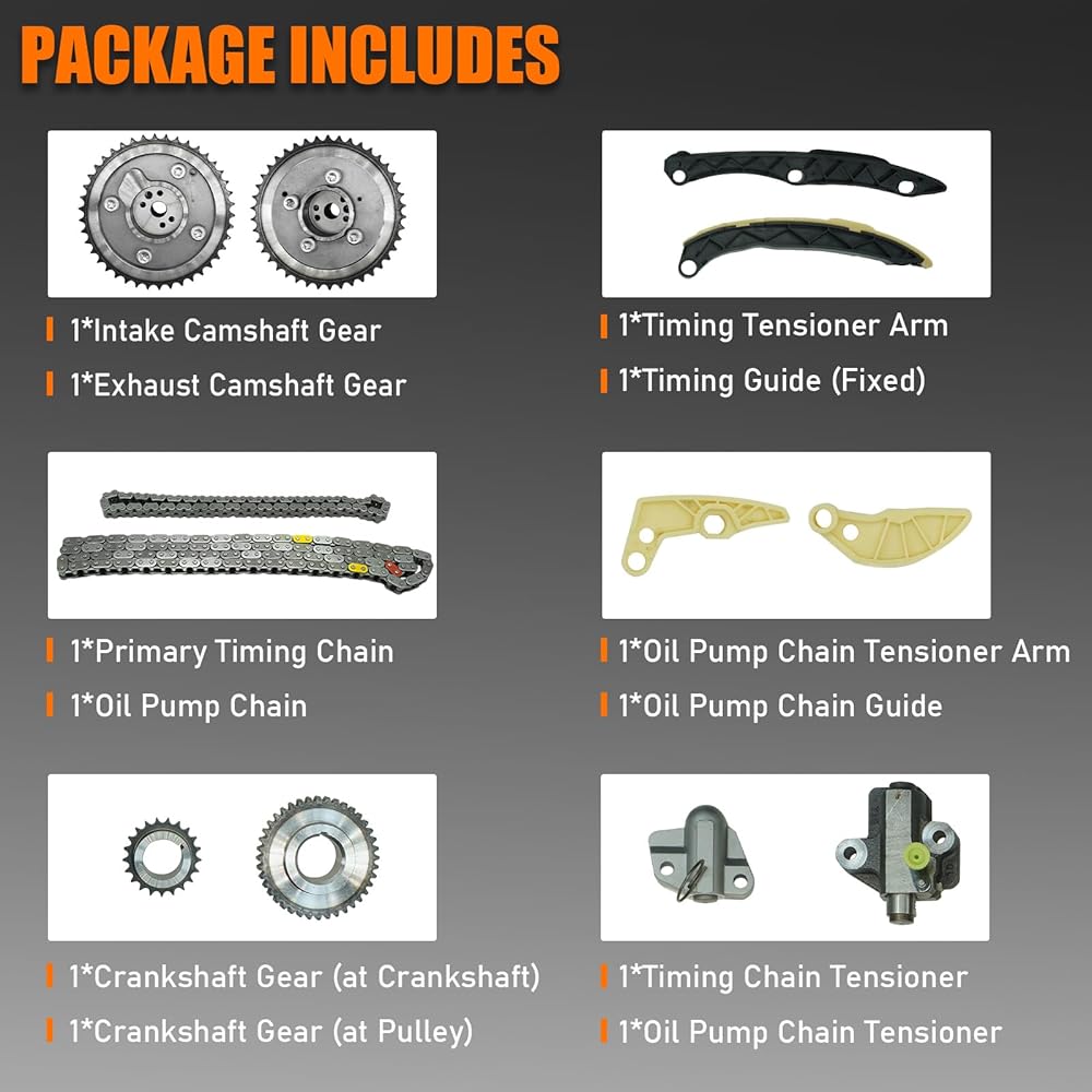 تتضمن الحزمة: 1 * سلسلة التوقيت-142L: 24321-2G111, 243212G111; 1 * مدخل كام عمود الحدبات VVT Cam Phaser: 24350-2G750, 243502G750; 1 * عمود الحدبات العادم VVT Cam Phaser: 24370-2G750, 243702G750; 1 * ذراع شداد سلسلة التوقيت: 24420-2C101، 244202C101؛ 1 * دليل سلسلة التوقيت: 24431-2G101، 244312G101؛ 1 * ذراع شداد سلسلة مضخة الزيت: 24461-2G350، 244612G350؛ 1 * دليل سلسلة مضخة الزيت: 24471-2G350، 244712G350؛ 1*74 سلسلة مضخة زيت الارتباط: 24322-2G350, 243222G350; 1 * العمود المرفقي المسنن: 23121-2G550، 231212G550؛ 1 * العمود المرفقي ضرس Bsm: 23121-2G590، 231212G590؛ 1 * مجموعة الموتر الهيدروليكي: 24470-2G350، 244702G350؛ 1 * مجموعة الموتر-سلسلة التوقيت: 24410-2G810, 244102G810