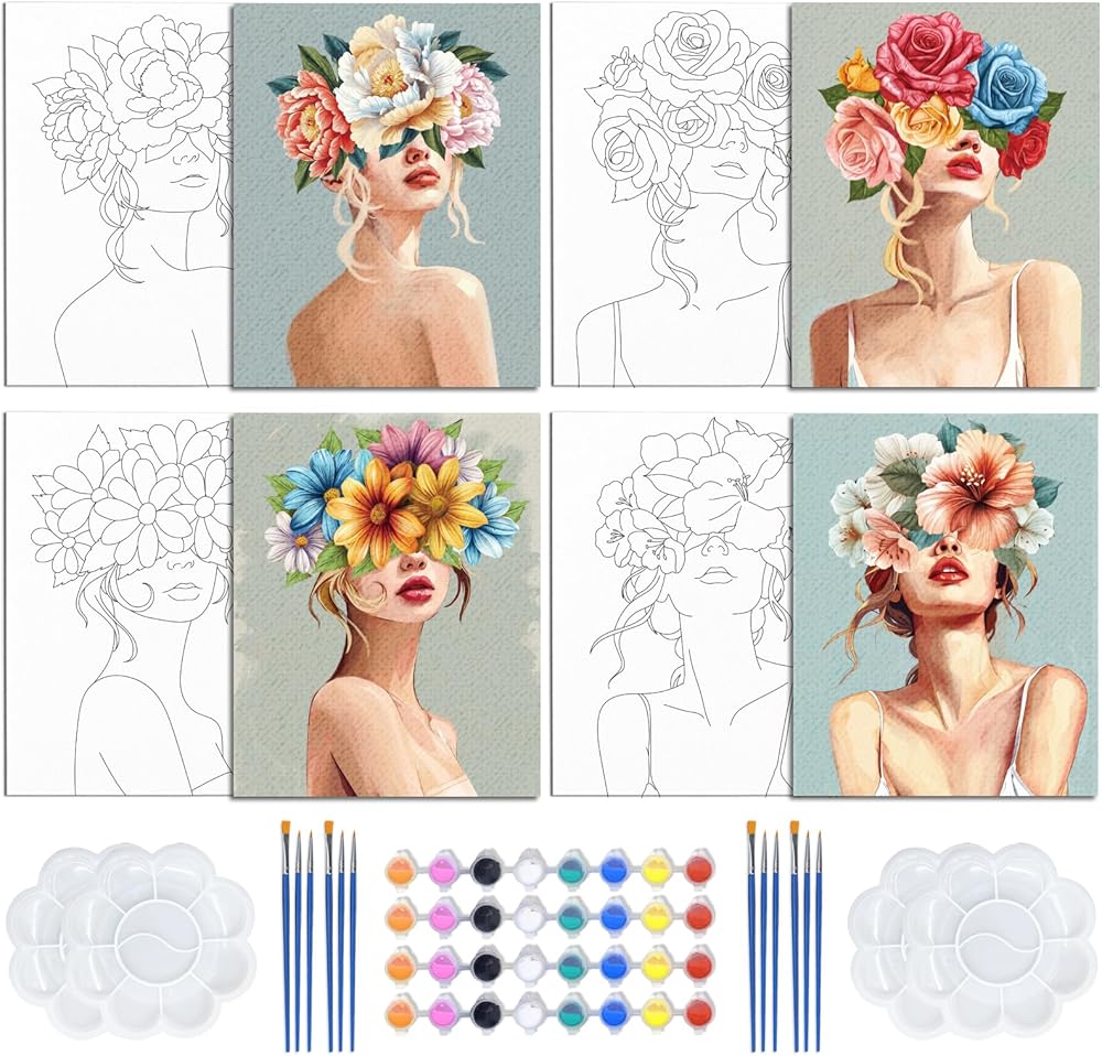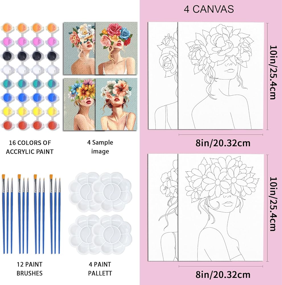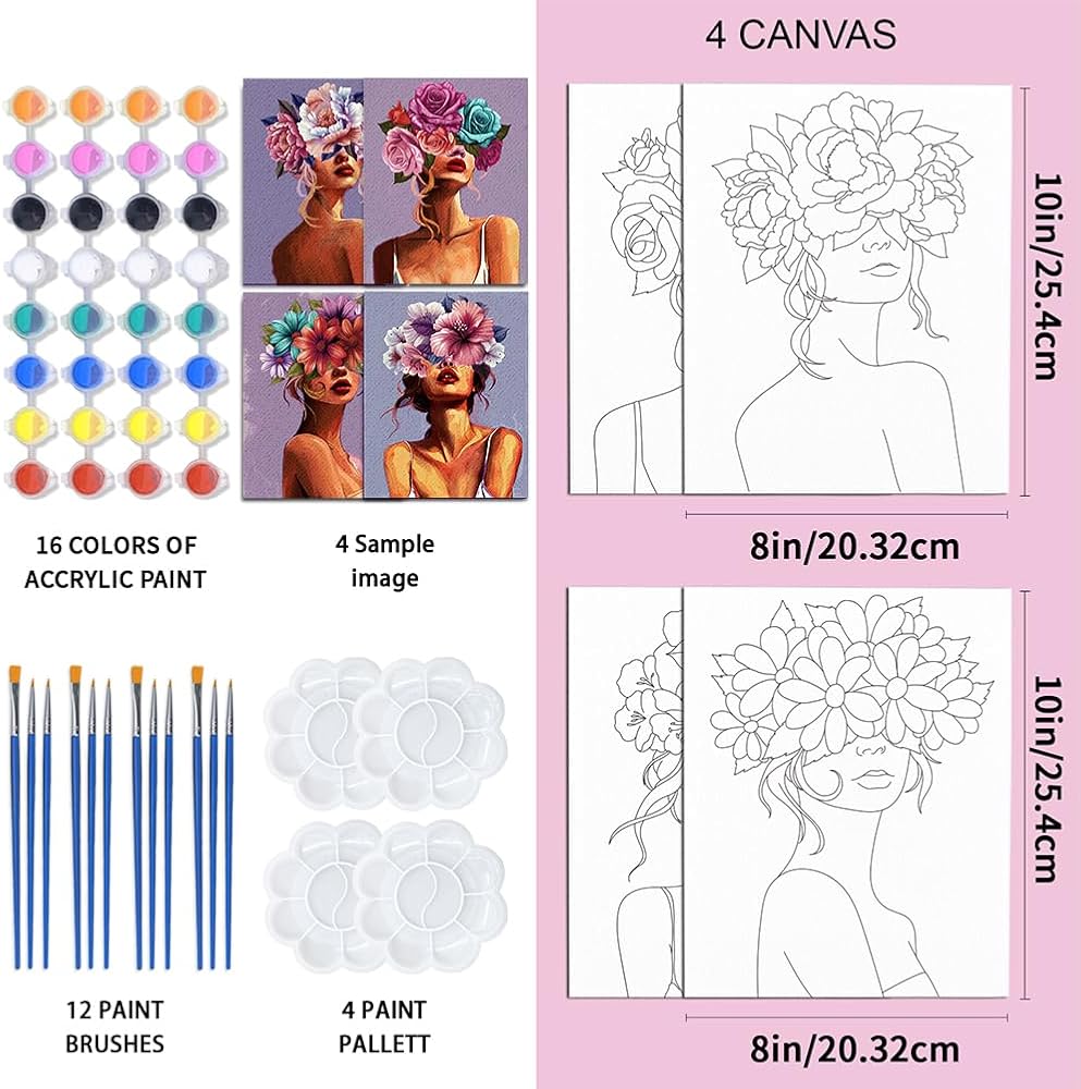 مجموعة مع أدوات الرسم: تحتوي مجموعة الرسم على القماش على 4 عبوات من القماش الممدد مسبقًا للرسم، 4 × 8 ألوان أكريليك، 12 فرشاة رسم، 4 لوحات، 4 ملصقات.