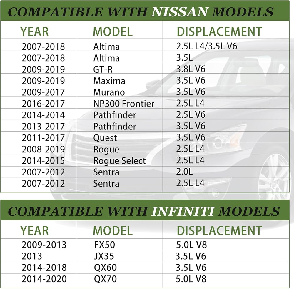 • [متوافق مع الموديلات:] متوافق مع نيسان: ألتيما 2007-2017 2.5L L4/3.5L V6، GT-R 2009-2021 3.8L V6، ماكسيما 2009-2017 3.5L V6، مورانو 2009-2017 3.5L V6، NP300 Frontier 2016-2017 2.5L L4, باثفايندر 2013-2017 3.5L V6, كويست 2011-2017 3.5L V6, روغ 2008-2017 2.5L L4, روغ سيليكت 2014-2015 2.5L L4, سنترا 2007-2012 2.5L L4.