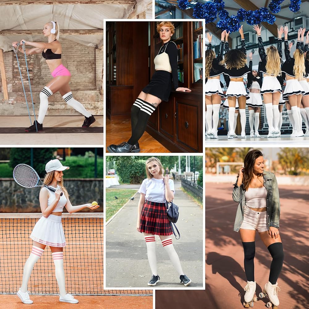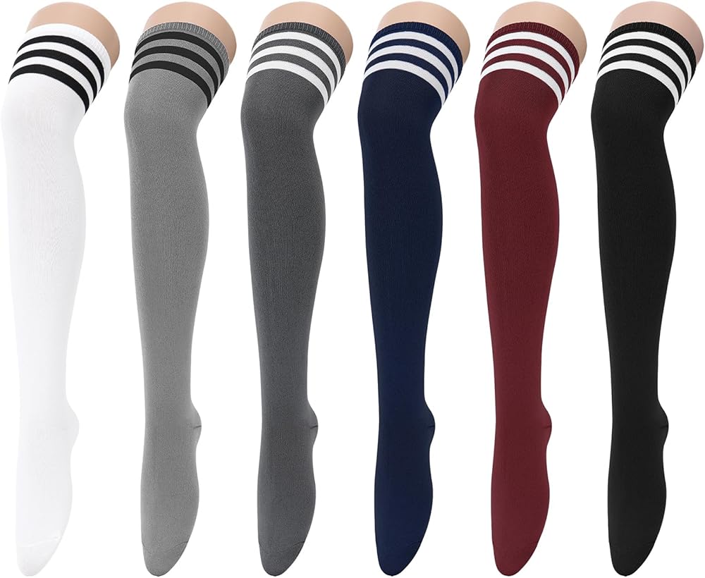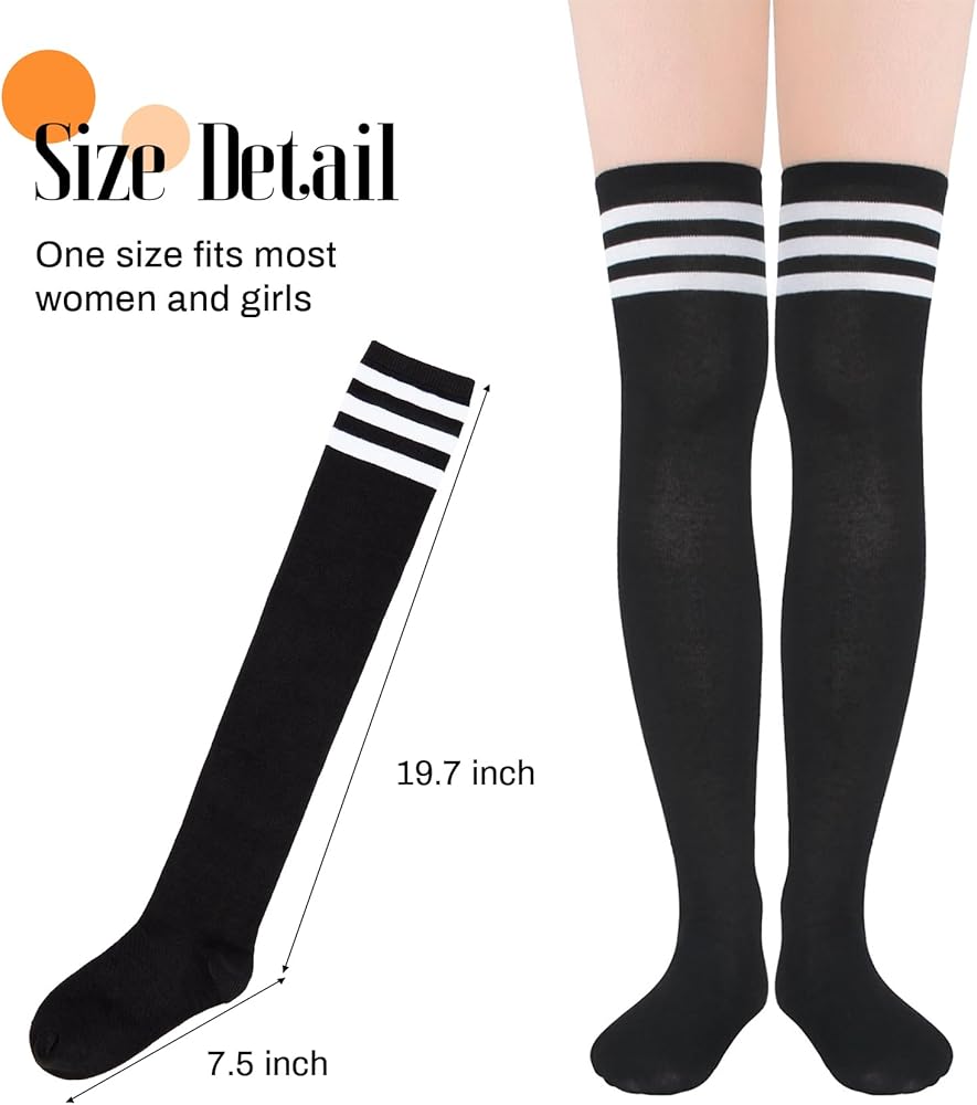 كمية وحجم العبوة: تتضمن العبوة 6 أزواج من الجوارب الكلاسيكية المخططة أو ذات الألوان الصلبة، يرجى الاختيار وفقًا للصور؛ يصل طول الجوارب العالية للفخذ إلى 55.88 سم من الكعب إلى طرف الأكمام وتمتد حتى الركبة، ومناسبة للنساء بمقاس قدم 6-9، مقاس واحد يناسب معظم النساء والفتيات.