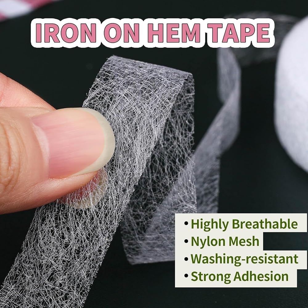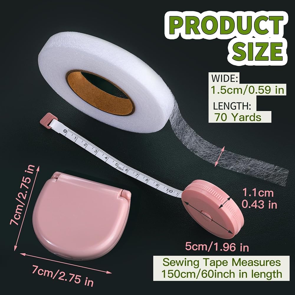 مستلزمات الخياطة الأساسية - تأتي مجموعة الخياطة المحمولة هذه مع لفة من شريط حاشية لاصق فائق الوزن على الوجهين، و1 شريط قياس ناعم ومرن ومحمول على الوجهين، ومجموعة خياطة صغيرة سهلة الاستخدام تحتوي على كل ما تحتاجه لصنع أساسيات تعديلات الخياطة. مقاس شريط الحاشية هذا هو 1/2 بوصة × 70 ياردة (15 مم × 64 م).