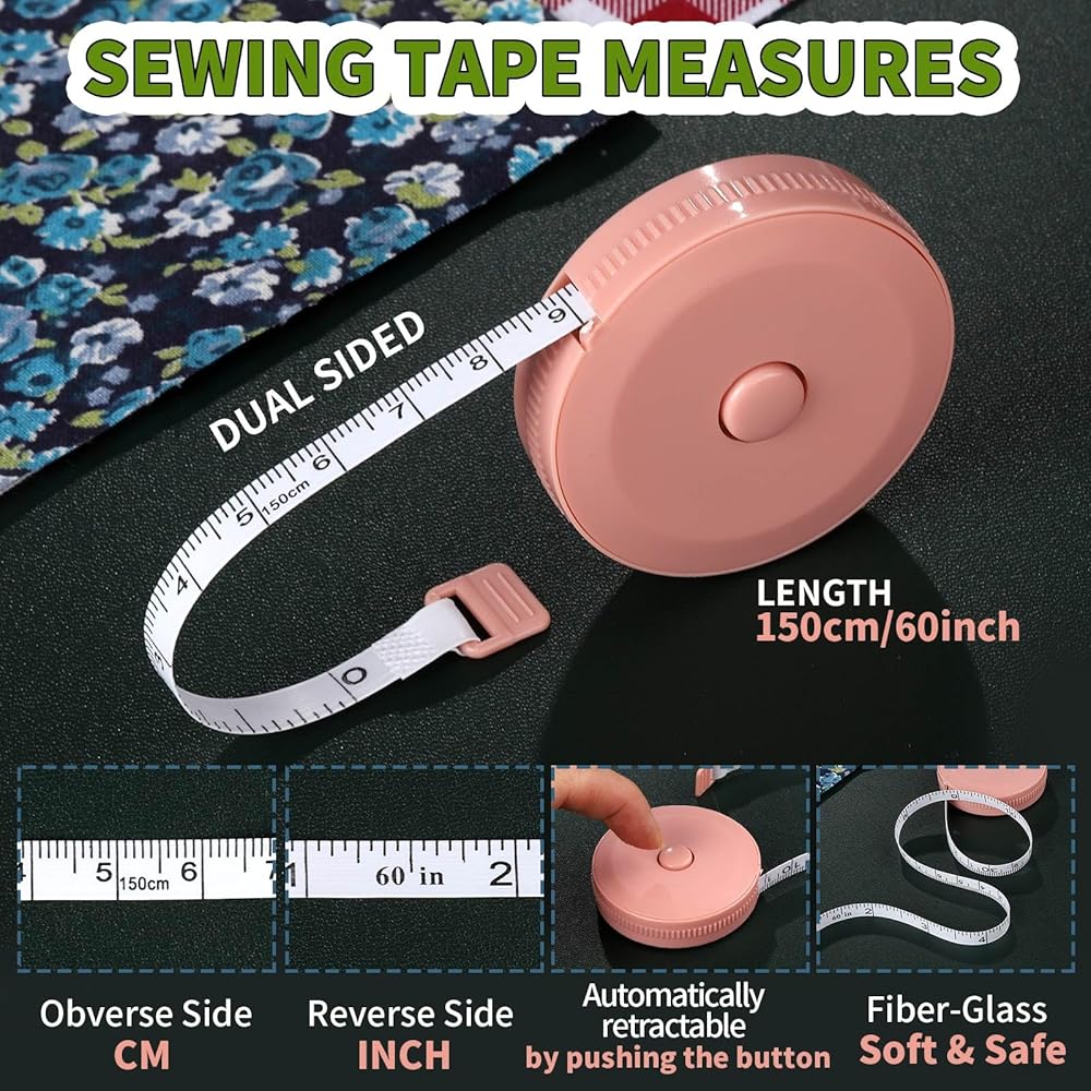 قياسات شريط الخياطة - شريط القياس الناعم قابل للسحب بالضغط على الزر الموجود في منتصف الصندوق البلاستيكي لسحب المسطرة الطويلة. يتم تحديد قياسات شريط الخياطة بالبوصة على أحد الجانبين والسنتيمتر على الجانب الآخر، ويبلغ طوله 150 سم/60 بوصة. شريط قياس ناعم مناسب للخياطة أو الحرفي أو صانع اللحاف أو أي شخص يحتاج فقط إلى شريط قياس مرن