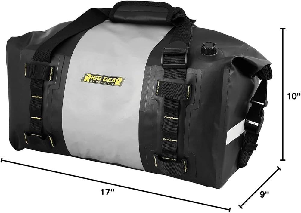 LIFETIME WARRANTY 100% waterproof duffle bag All seams are electronically heat welded Made from waterproof and durable PVC Tarpaulin Watertight roll closure with quick release buckles Outer material cleans easily and prevents slipping or marking Securely mounts using patented RIGG STRAPS system RIGG STRAPS can also be used as a separate tie down system Removable Internal stiffener helps bag hold its shape Can be mounted across or along seat or tail section Purge valve makes for compression easy Dual-purpose carry handles can be used as compression straps Reflective accents for enhanced visibility Easily mounts to motorcycle, PWC and snowmobile Available in Black/Gray SE-4025 Main compartment measures: 17”L x 9”W x 10”H; holds approx. 25 liters