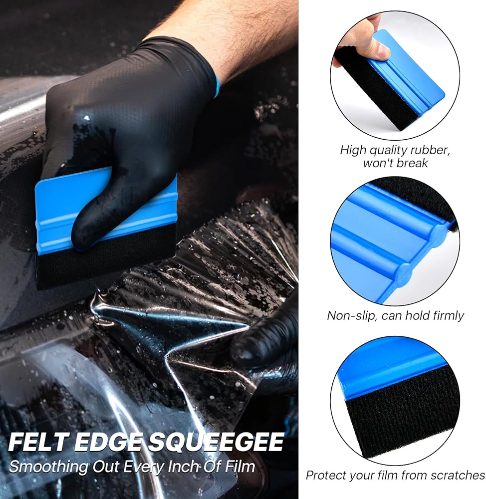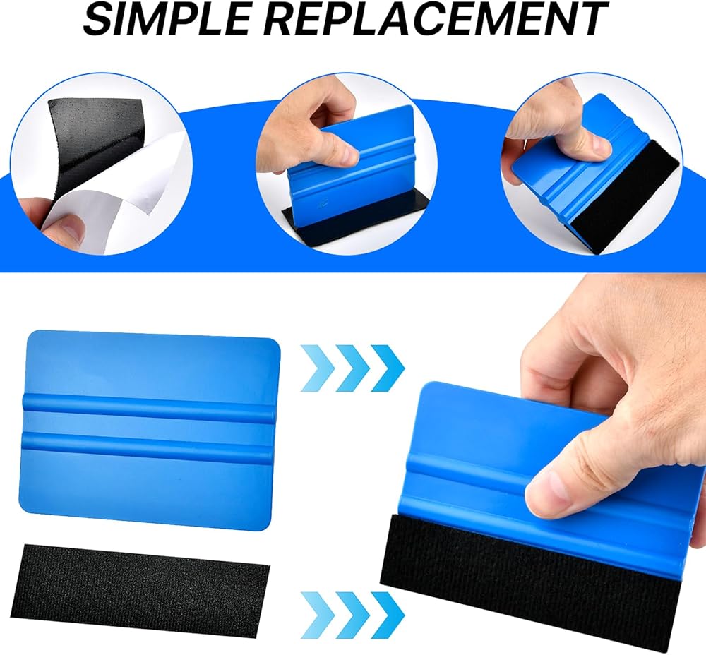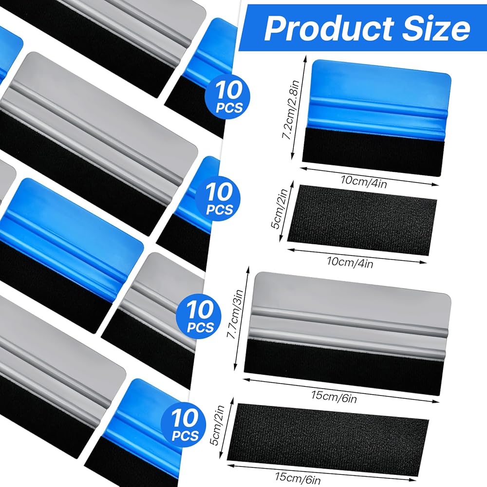 Want to complete all kinds of lamination projects easily? Choose our vinyl squeegee tool kit, it is definitely your smart choice! This vinyl squeegee with felt edge set includes 10 x blue felt-edged rubber squeegees, 10 x gray felt-edged rubber squeegees, and matching replaceable fabric felts in sufficient quantities to satisfy your needs for different sizes while allowing you to enjoy efficient work, making your operations more manageable and improving work efficiency Vinyl Squeegee: