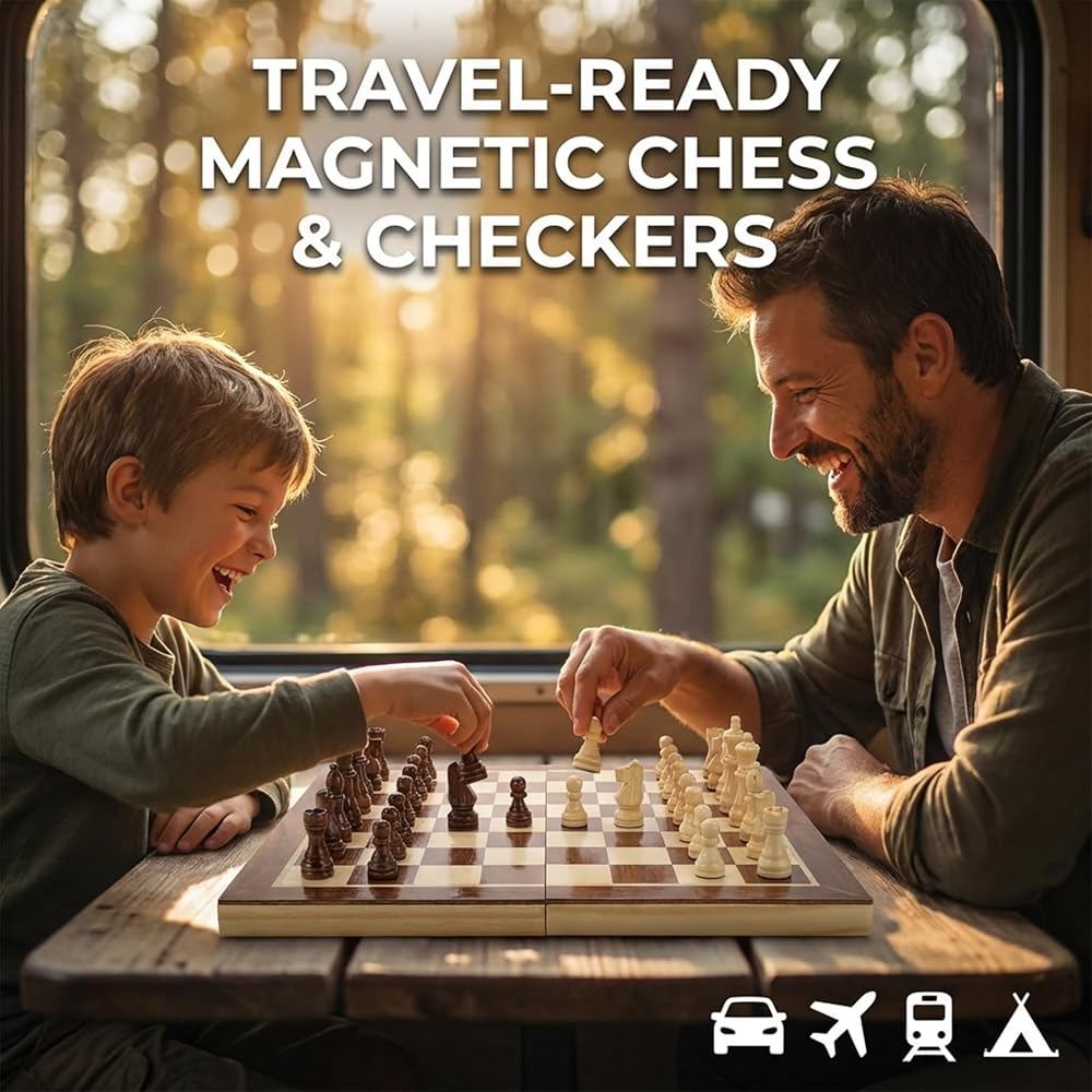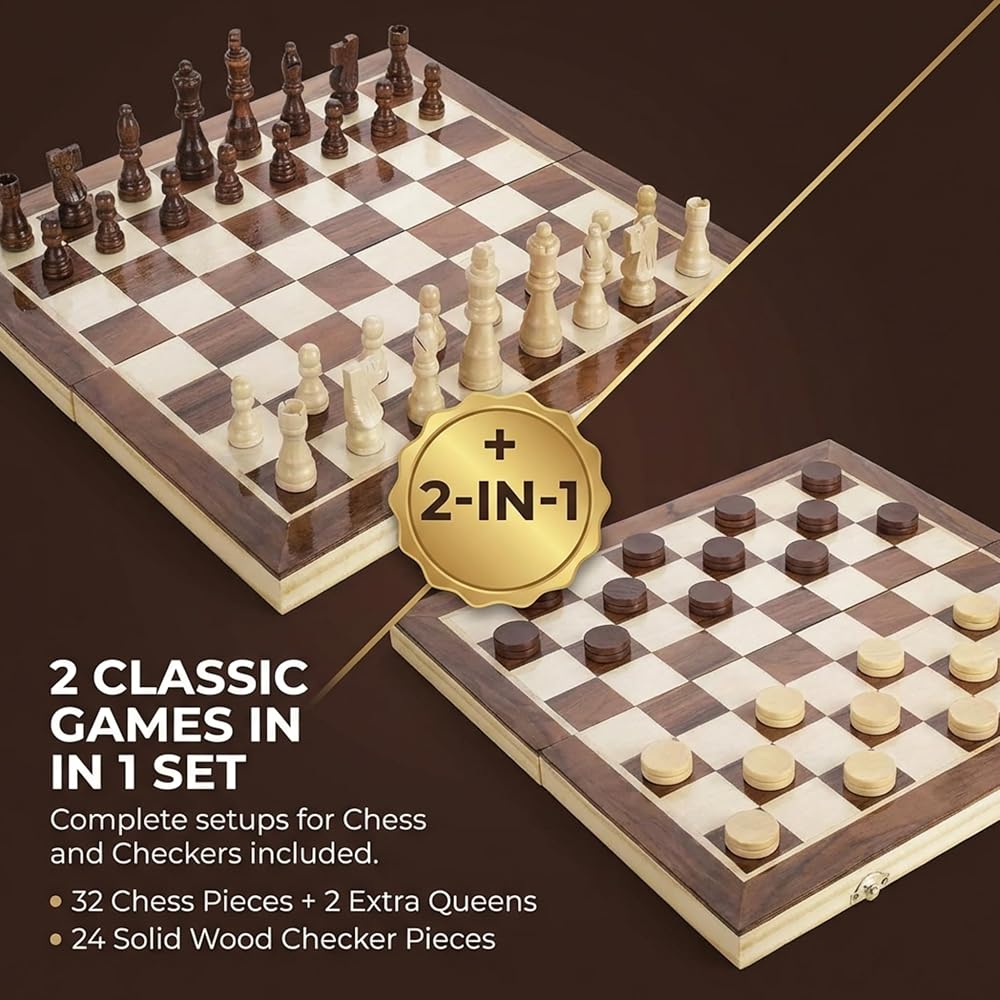 مجموعة الشطرنج والداما المغناطيسية الخشبية، لوحة شطرنج قابلة للطي مقاس 15 بوصة | مجموعة شطرنج 2 في 1 من الخشب الصلب للبالغين مع صندوق تخزين، ملكتين إضافيتين، مجموعة شطرنج محمولة للسفر للأطفال والمبتدئين