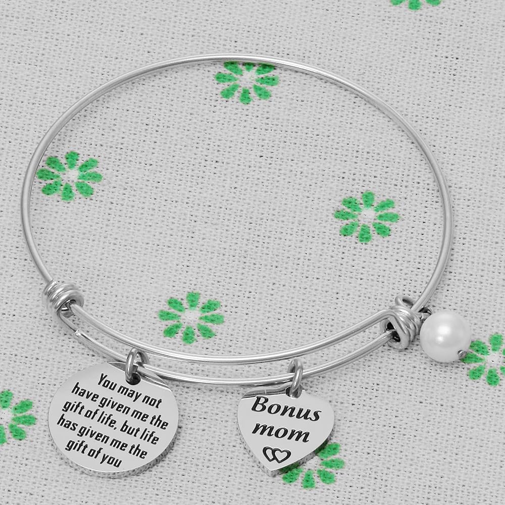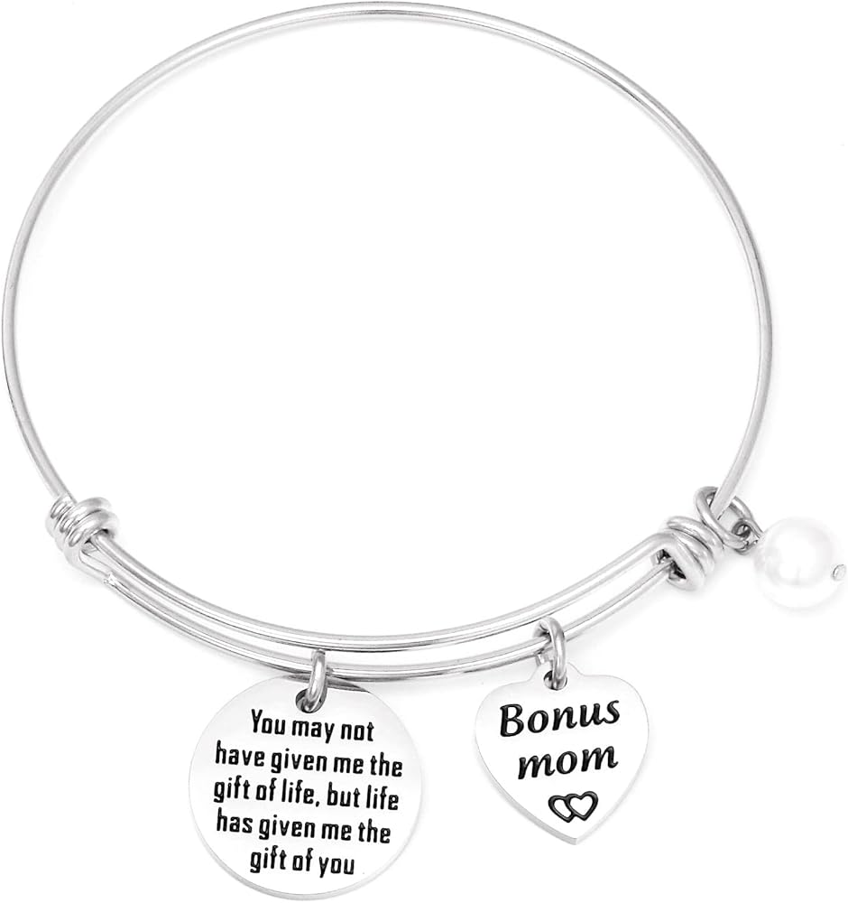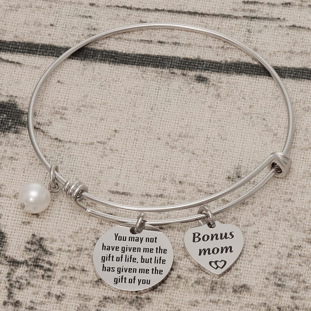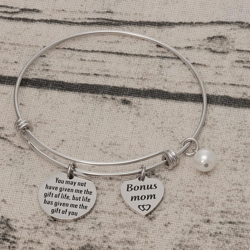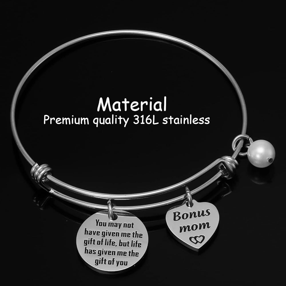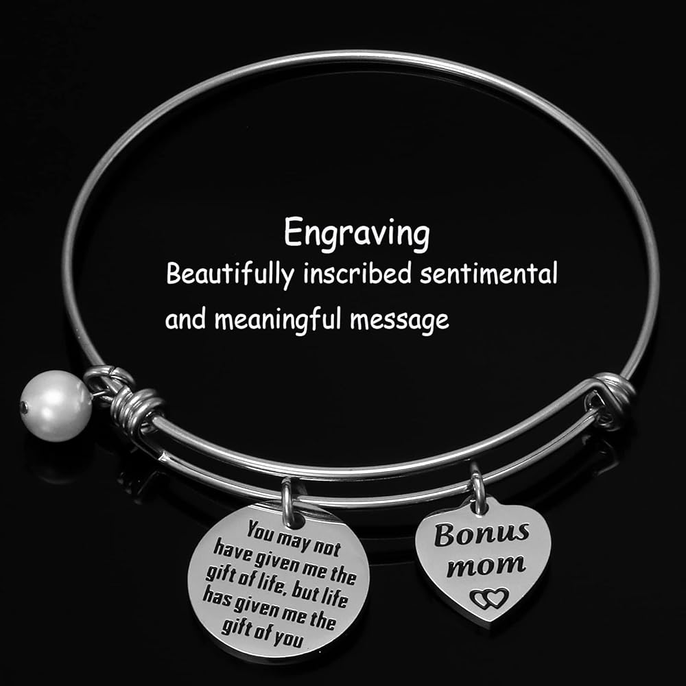 • 💗💗💗💗💗---Engraved with the sentence "You may not have given me the gift of life, but life has given me the gift of you". A very thoughtful bracelet for your stepmom, mother in law. A unique and beautiful bracelet sure to be loved by the one who receives it, tell your mother or daughter how much you love her. Perfect for daily wearing and any gift giving occasions.