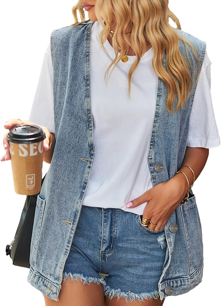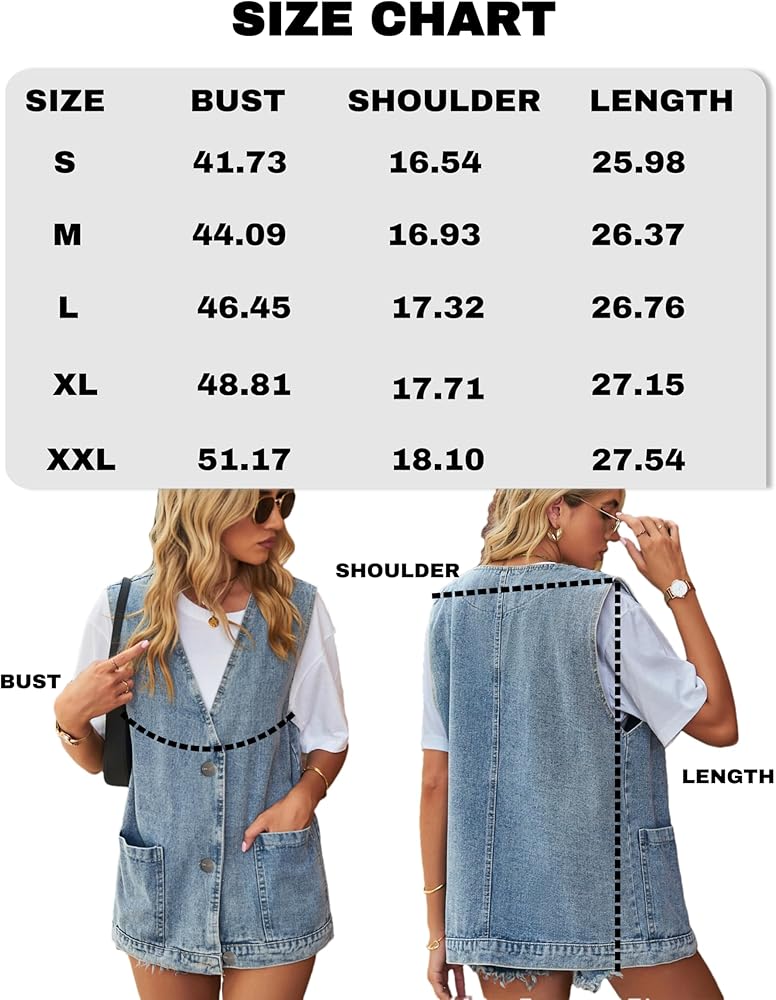 - المزايا: سترة من الدنيم بدون أكمام للنساء، جيبان جانبيان كبيران، رقبة على شكل حرف V، صدر واحد، طول متوسط، سترة من الدنيم القديم، دنيم مغسول ناعم ومريح