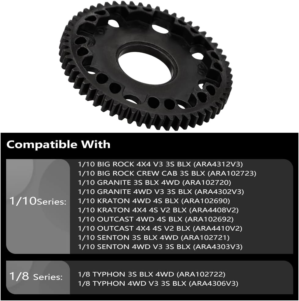 • 【Compatible with】Suit for 1/10 Arrma senton 3s spur gear, Granite 3s spur gear, Big Rock 3s spur gear, Kraton 4s spur gear, Outcast 4s spur gear, 1/8 Typhon 3s spur gear. (Notice: Not compatible with 1/10 Arrma 550 6S vehicle).