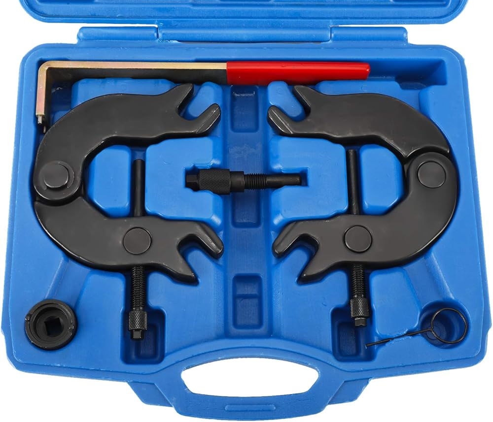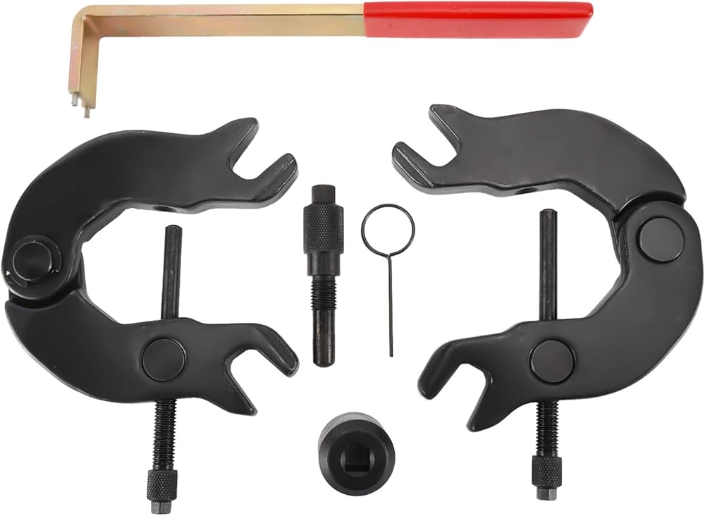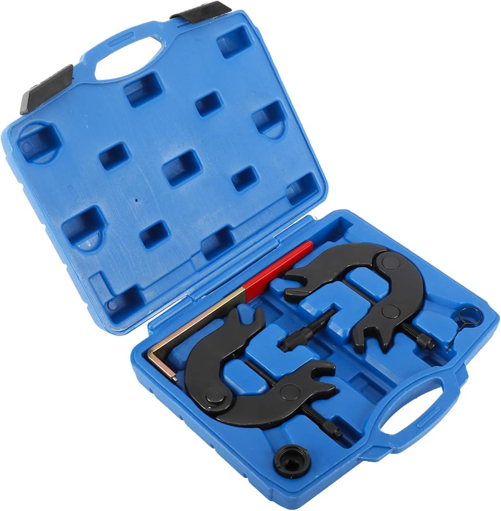 Features: Two Locking Alignment C Fixtures (Right and Left) that interface with camshafts for securing/maintaining TDC, Applicable: The timing tool kit fit for 2000 2001 2002 2003 2004 Audi A4 and for Audi A6 with 3.0L V6 5V AVK or BBK series of engines, for all years Audi A6 with Z15L TDI engines, for VW Polo Diesel versions, for 1991 1992 1993 1994 Audi 100 C4 (Sedan and Avant versions), The Timing Belt Tool Kit is Compatible with VW Polo Diesel, Compatible with Audi 100 since 1991, Compatible with AUDI A6 with engine Z15L TDI, Special 3/8" Drive Socket designed specifically to adjust the variable timing on the exhaust camshaft to base position when performing timing belt or other front-engine services fit Audi 3.0L, 5 valve engines, These tools constructed from heavy-duty forged steel with black-oxide finish on adapters for maximum strength and longevity that resists rust and corrosion. Package includes: 2x Camshaft Locking Fixtures (C-shaped), 1x TDC Locating Locking tool, 1x Tensioner Wrench with Grip, 1x" Drive Camshaft Adjuster Socket (3/8"), 1x Tensioner Locking tool.