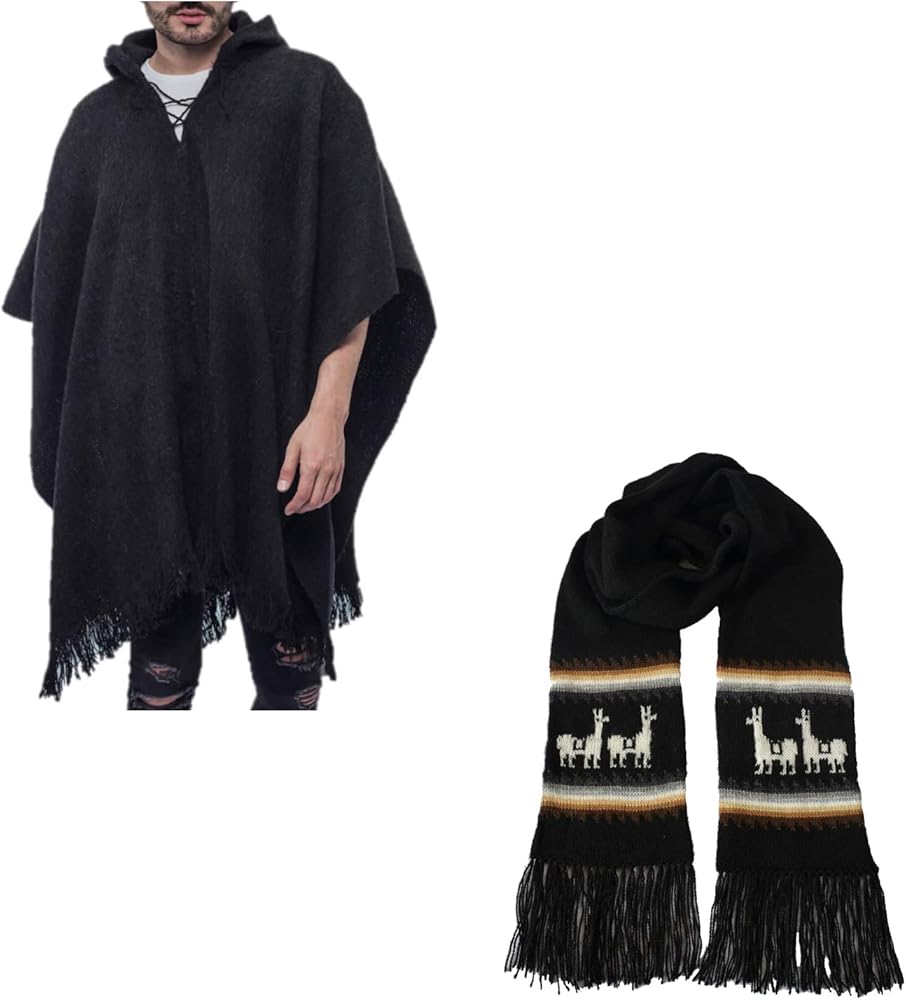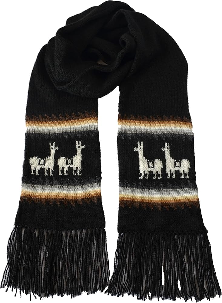 وشاح الألبكة الإضافي: هذا المنتج مصنوع يدويًا بنسبة 100%. وشاح أسود بخطوط أفقية باللون الأبيض الفاتح. يعرض تصميم اللاما النموذجي من بيرو