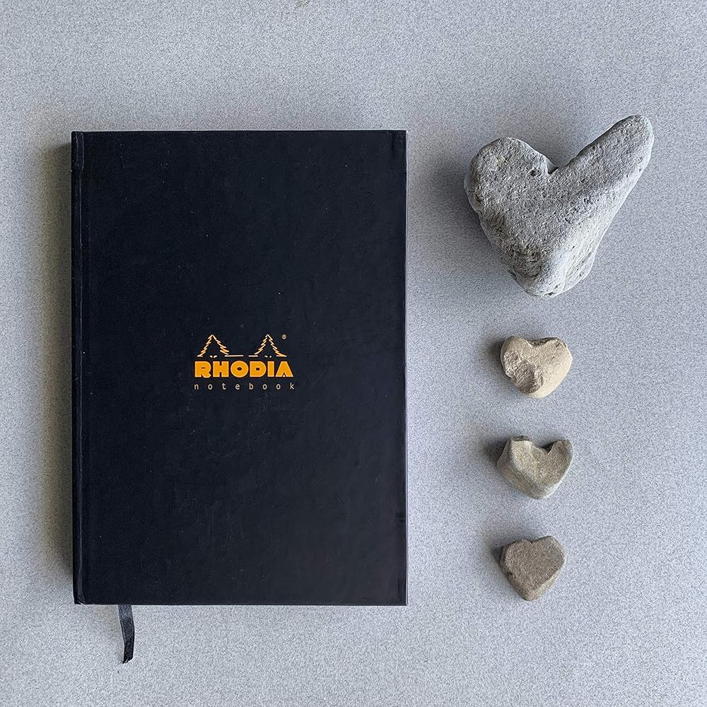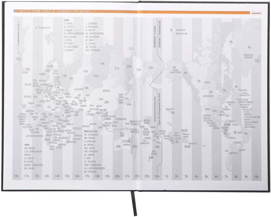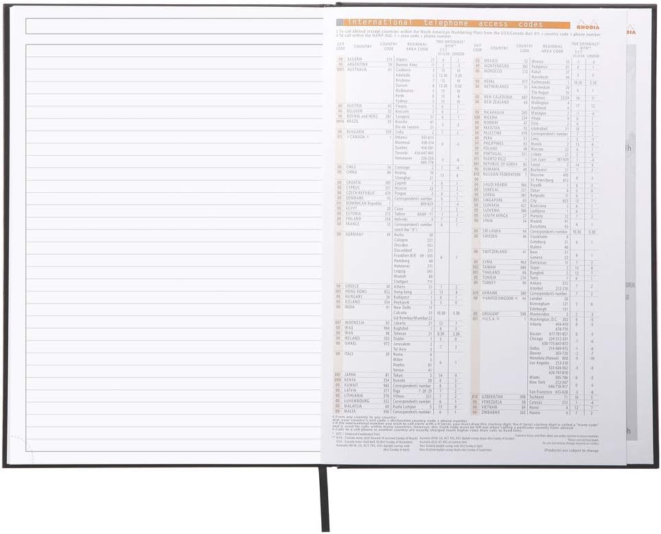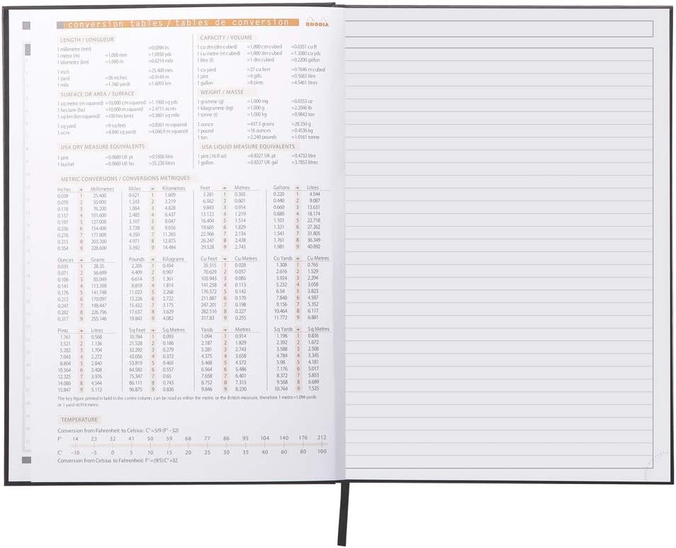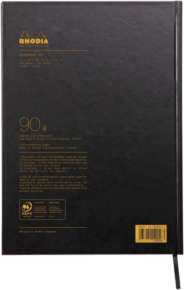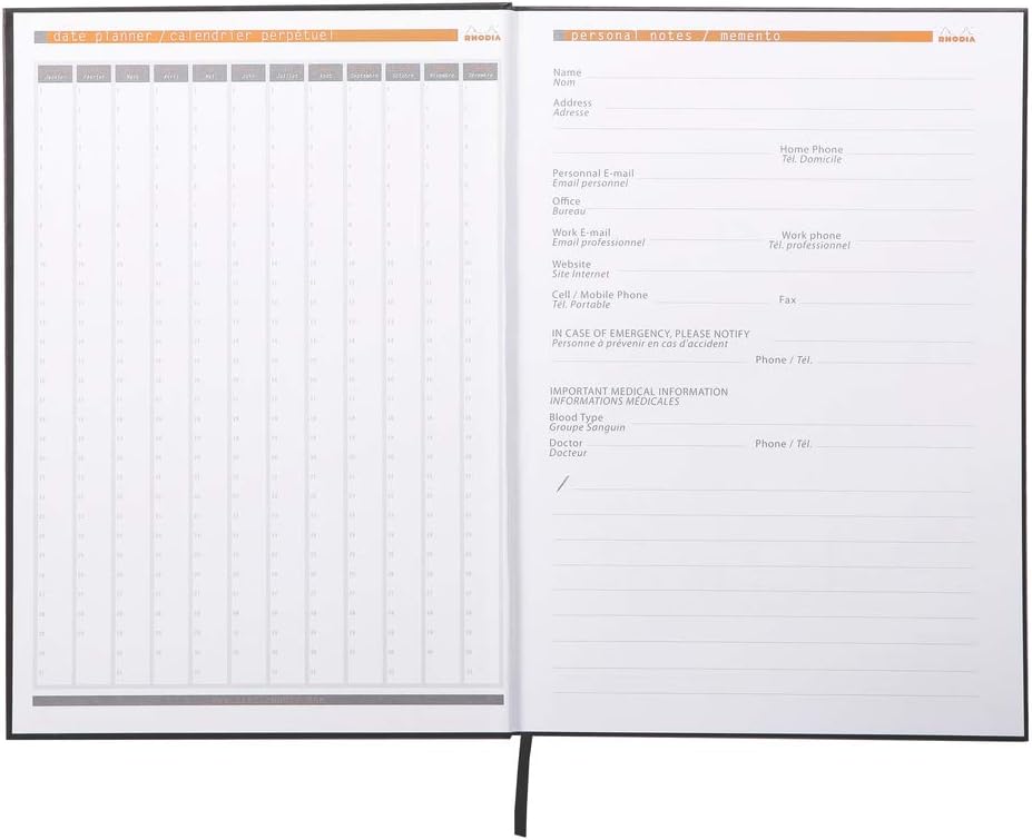 The Rhodia active notebook has a hardback cover and a glued spine. The notebook is A4 in size and has 96 unpunched sheets. The notebook comes with a black ribbon bookmark, a date planner and other useful information. Each sheet has a microperforated bottom corner.