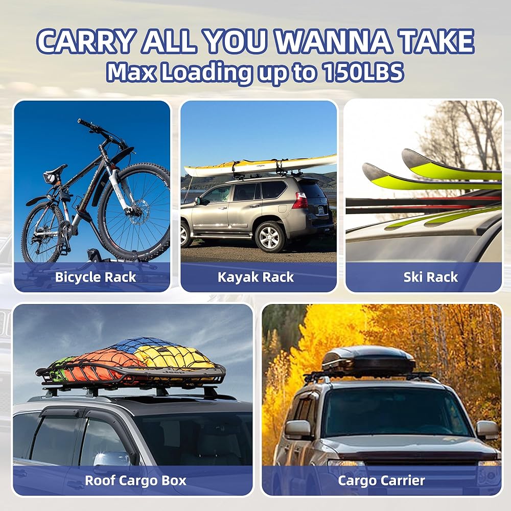 • 👍【Maximize Your Car Capacity】Elevate your vehicle's carrying capabilities with 150LBS(68KG) load-bearing capacity. It provides a good base and convenience for items that can't fit in the car. Now, you can effortlessly transport large items like luggage racks, surfboards, camping gear, mountain bikes, and skis, making your journeys smoother and more enjoyable.