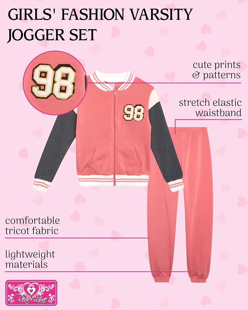 OFFICIAL REAL LOVE: Girls' Fashion School Varsity Jogger Set; We believe that clothing should give you confidence, We believe that clothing should feel like Real Love