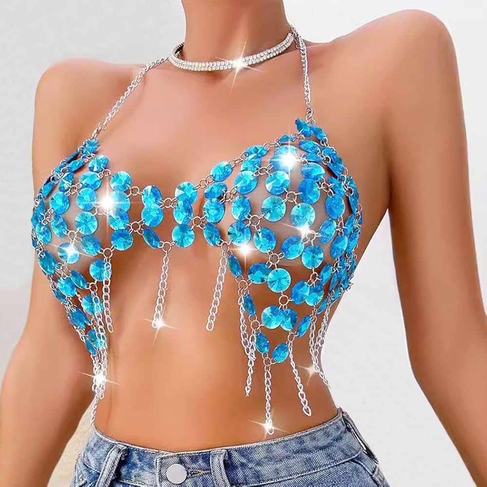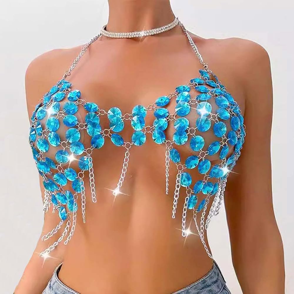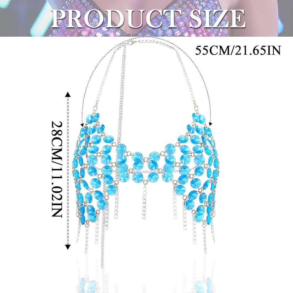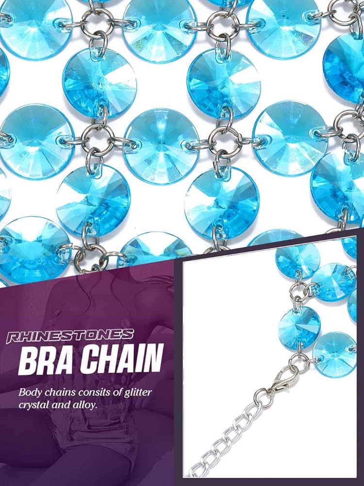Blue Crystal Bra Chain for Women Aukmla brand originated in 1989, we are specializing in women party and nightclub bra body chains. We are committed greatly to fashion point for rhinestones body accessories in heart of women. Meet their need and make you pretty and beautiful in a crowd. We also create different festival rave dress such as party,wedding,cocktail. We sell around all over the world, creating good quality products for women. Rhinestones Halter Chest Body Chains for Nightclub Beach bikini body jewelry is made of crystal. Unique design is make you in the party. Rave chest chain approx size: inches/cm length. Easy to wear and take off. Backless Clubwear is unique design. Sparkly halter bra chains can made you eye-catching. Glitter clubwear is for music festivals, prom, nightclubs,date night, birthday parties, carnival parties, Halloween and so on. Rhinestone chain bra is a decoration for you in the special occasion. Beach Bikini Body Jewelry Accessories for Party Aukmla brand create body jewelry for women, making you more attractive at any party. Backless summer bikini pass warmth and happiness to women.
