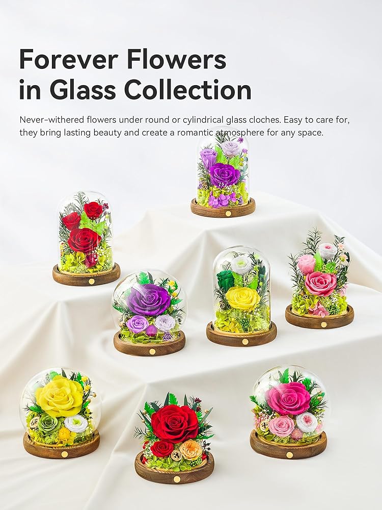 زهور حقيقية 100%: الورود والزهور الأخرى طبيعية وحقيقية، ويتم الحفاظ عليها بدقة في ذروة إزهارها، وتحافظ على شكلها الأصلي وسطوعها لمدة عام على الأقل.