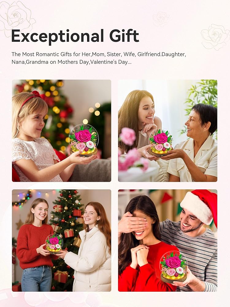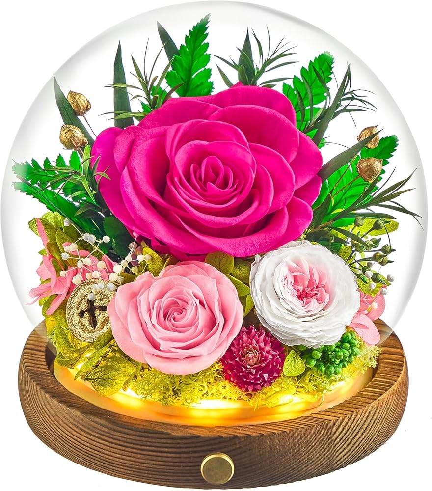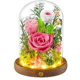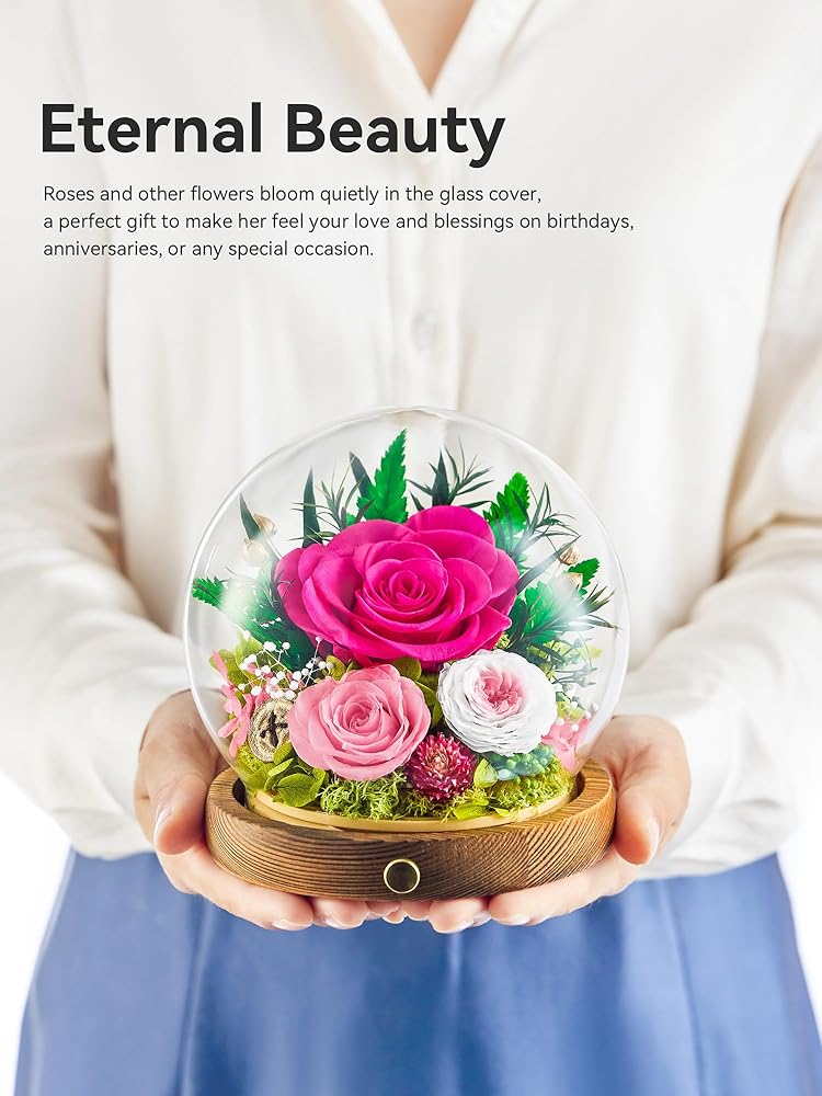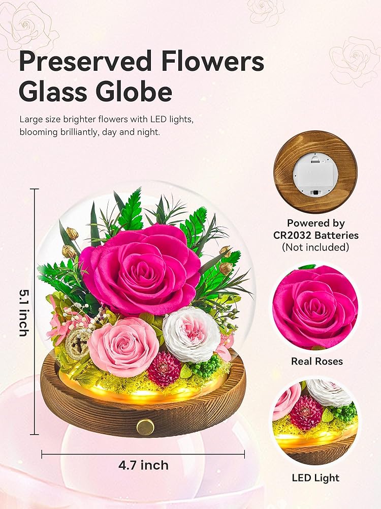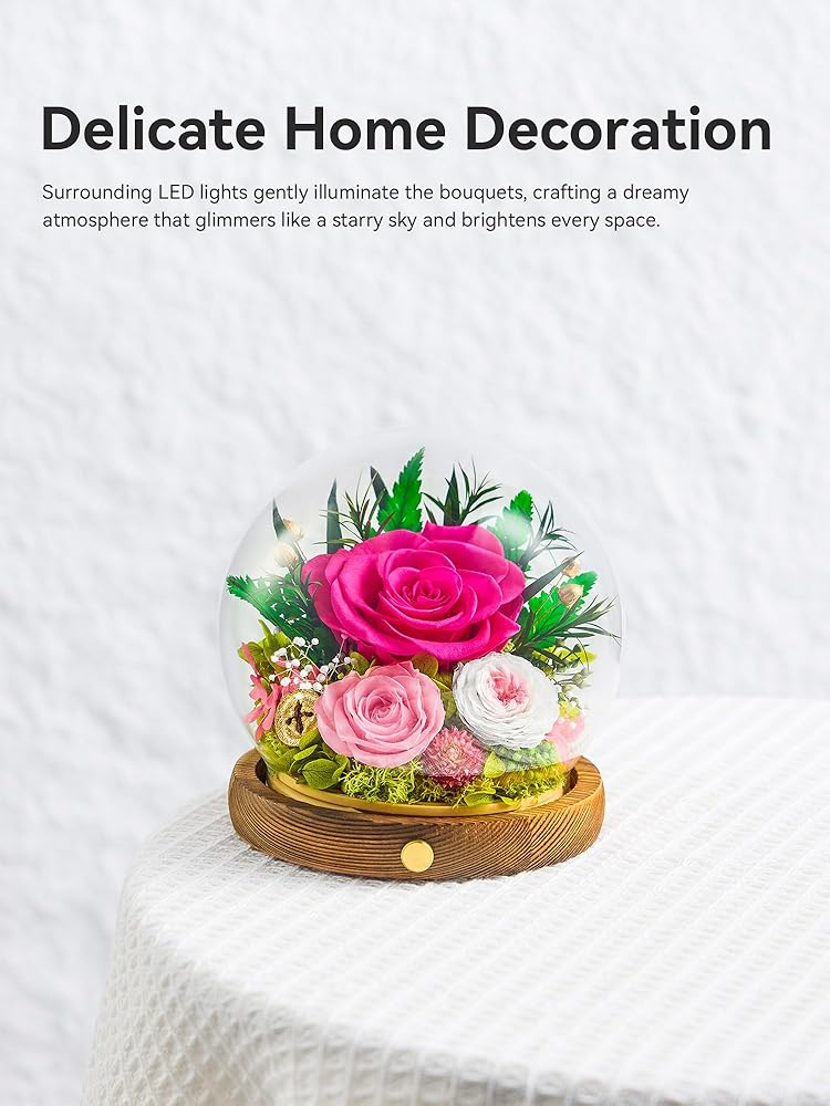 تصميم رائع: يمكن لتصميم الغطاء الزجاجي الكروي الشفاف أن يعرض جمال الزهور بالداخل بزاوية 360 درجة. اضغط على زر التشغيل الموجود أسفل القاعدة الخشبية، وستبعث مصابيح LED حول الوردة توهجًا دافئًا ورومانسيًا، مما يلقي السحر أينما وضعته.