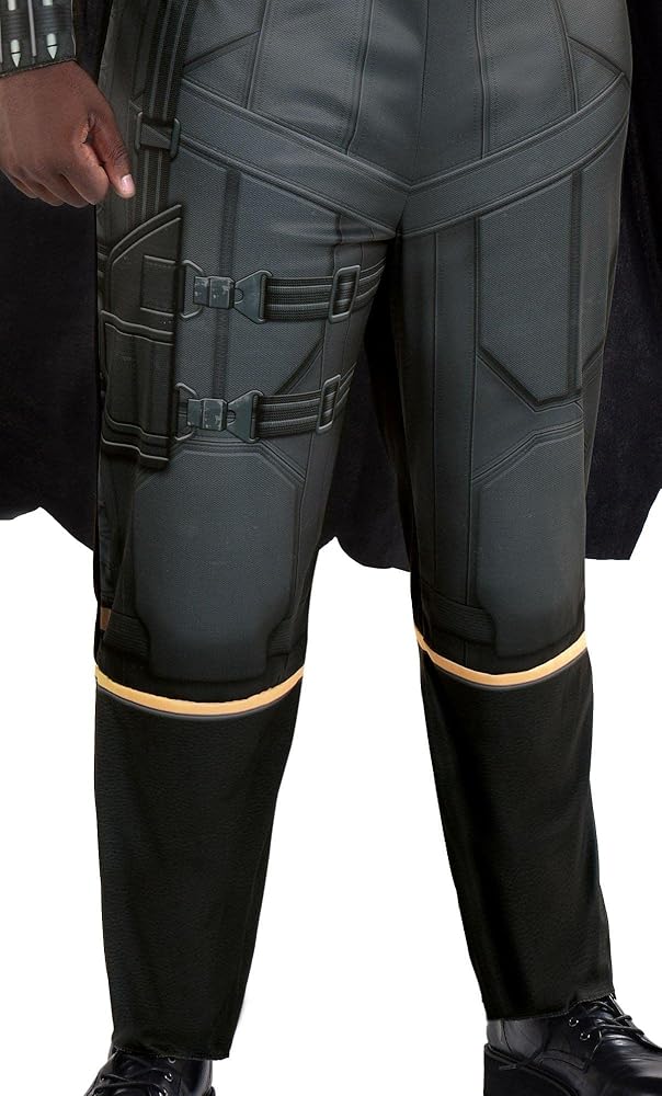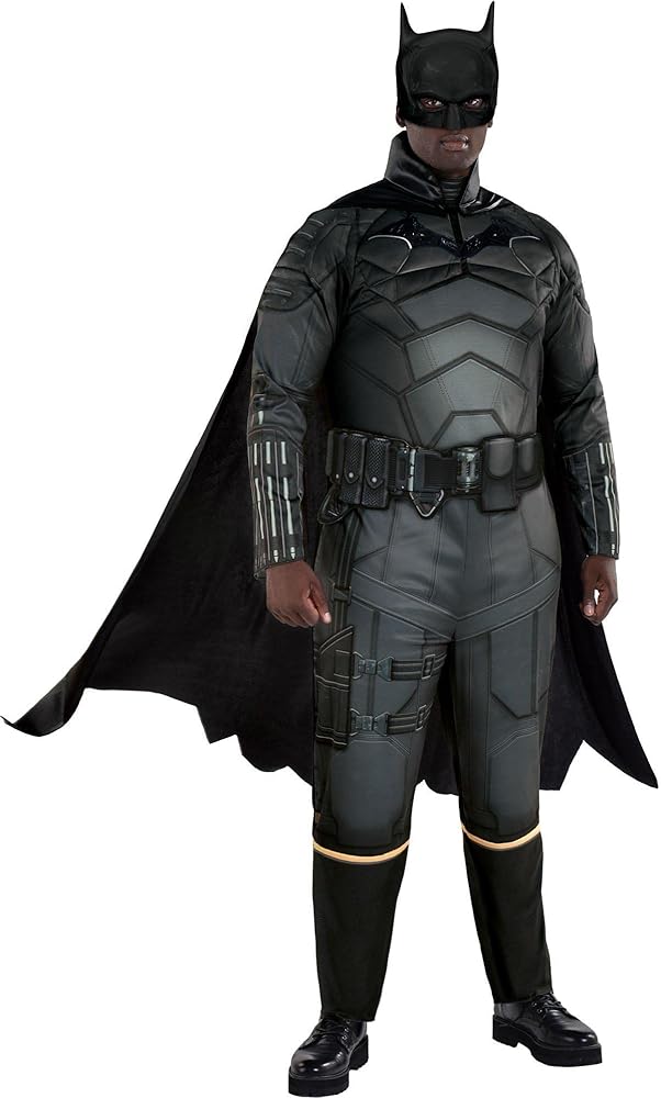The licensed Warner Brothers' Batman Costume fits adult men in a true-to-size for men up to 6'0” tall, chest 52”, waist 46”