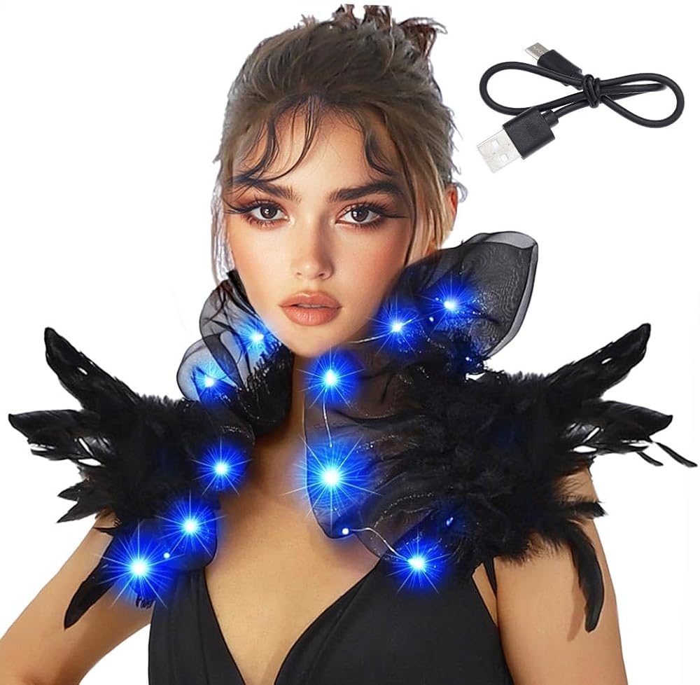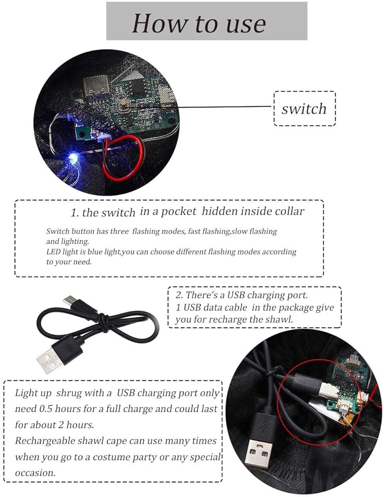 شالات وأغطية قوطية LED ذات ضوء أزرق. تحتوي السترة المضيئة على ثلاثة أوضاع للوميض، الوميض السريع، والوميض البطيء، والإضاءة. يمكنك اختيار أوضاع مختلفة حسب حاجتك. عند الاستخدام لأول مرة، تذكر أن تشحن بالكامل قبل الاستخدام.