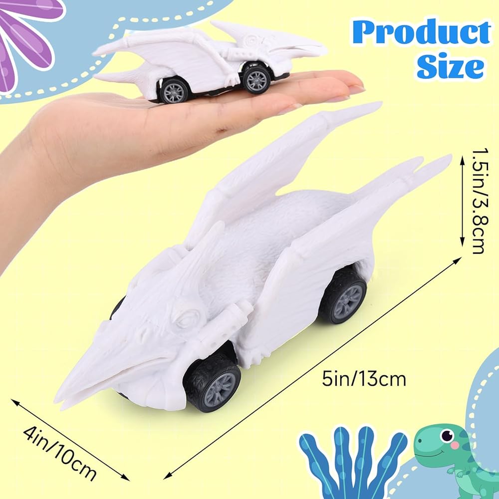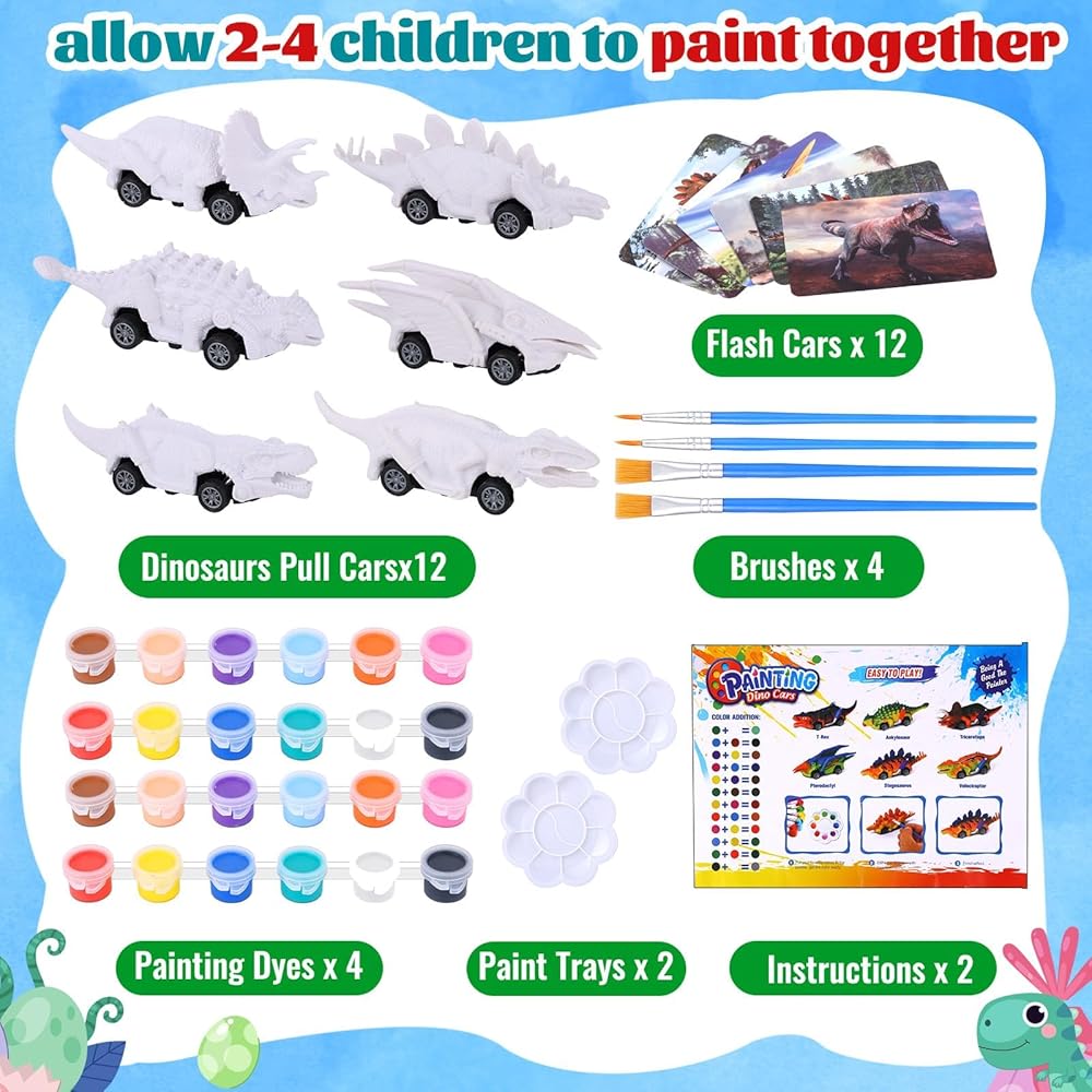 • Package Includes: you will get 12 pieces friction powered dinosaur cars uncolored, attached with instructions and 12pcs dinosaur cards, 2 pack of 12 colors pigments, 4pcs paint brush and 2pcs mini color palettes