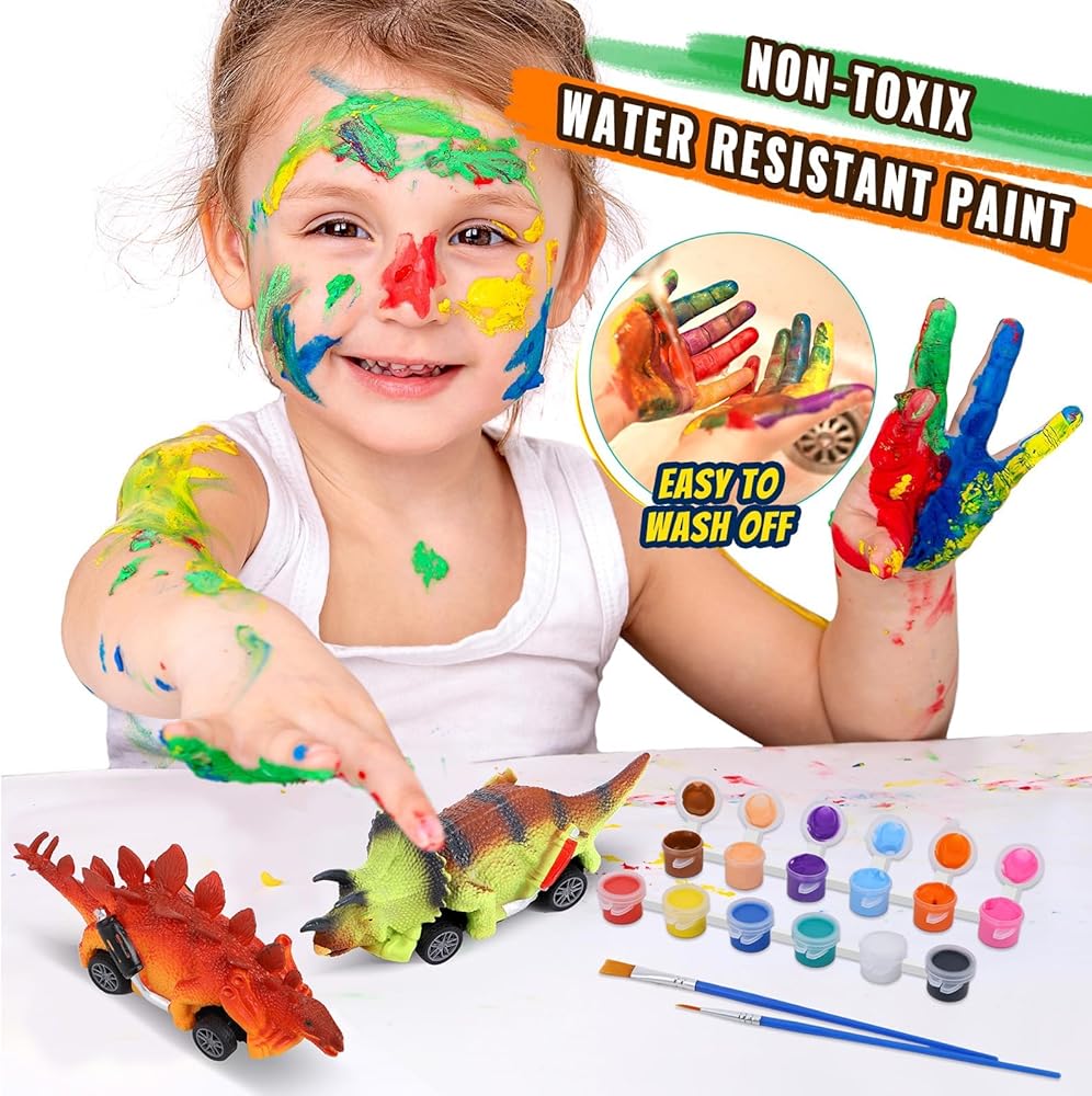 • Good Material: the toy cars and paints are safe and non-toxic, allowing parents to rest assured; children will use their unique imagination and hands-on ability to mix colors to create their own unique dinosaur cars
