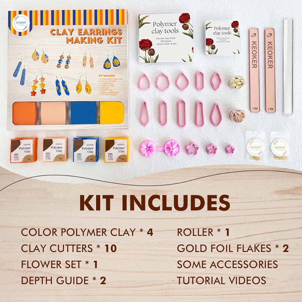 اصنع مجموعة أقراطك الخاصة - تتضمن مجموعة طين البوليمر الخاصة بنا لصنع المجوهرات الأدوات الأساسية لإكمال الأقراط: 23 قاطعة طين بوليمر، 5 ألوان من طين البوليمر، دليل العمق، شفرة الأنسجة، شاشة حريرية لطين البوليمر، بعض الملحقات وما إلى ذلك.
