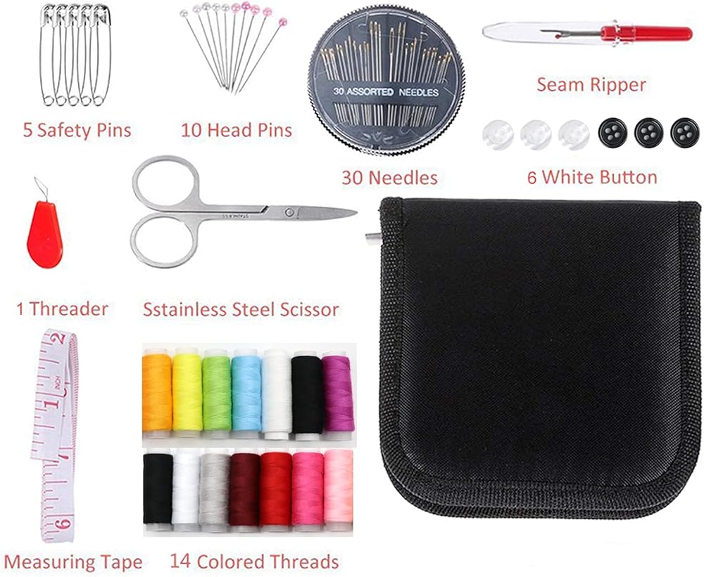 Sewing Kit for Traveler, Adults, Beginner, Emergency, DIY Sewing Supplies Organizer Filled with Scissors, Thimble, Thread, Sewing Needles, Tape Measure etc Size:74pcs Are you worried of Clothing rips, button pops, seams bursted, and always at the worst possible time Now you can choose Marcoon Sewing kit.It will be your constant companion at home, the office, camping, or traveling.It contains all the necessary tools that are required,Don't need machine to use, the best compact sewing kit that is always available, sewing kit easy to access for those quick,A kit that in a true sense makes your life easier. Our portable compact kit is packed with all the high quality sewing necessities you need: 1 x Needle and Thread Storage Package 12 x Thread Reels 30 x Assorted Hand Sewing Needles 10x Color Pins 10 x Pins 1 x Plastic Needle Threader 1 x Measuring Tape 1 x Stainless Steel Scissors 3 x Black Button 3 x White Button Product Details: Size: 5 x 4.2 x 1inch Weight:4.5 OZ