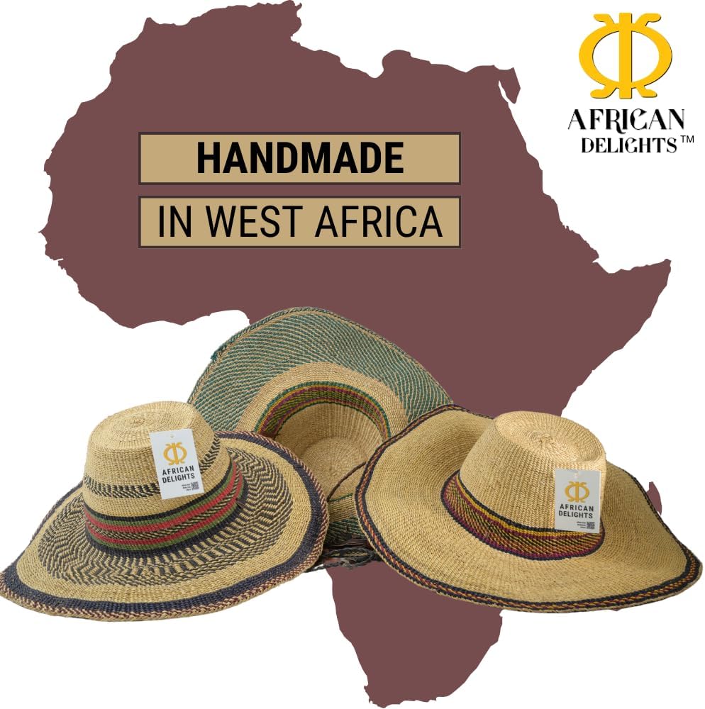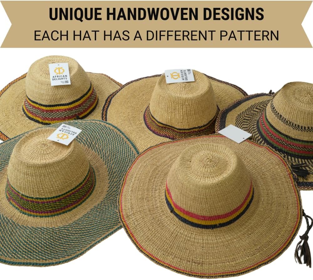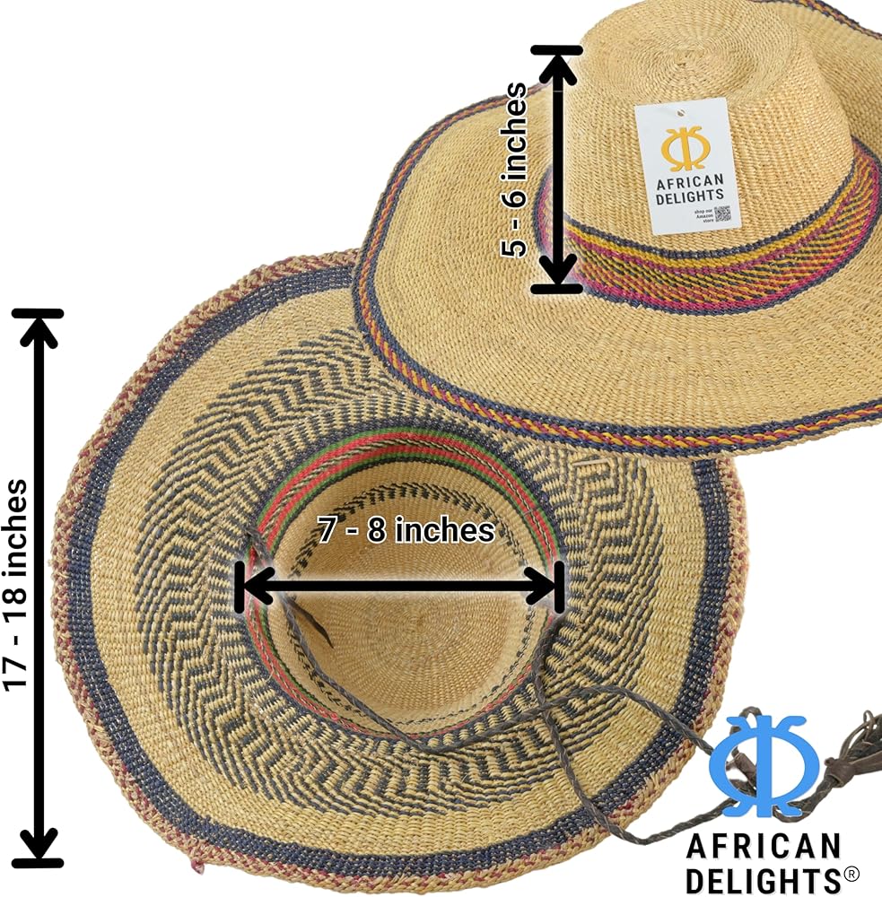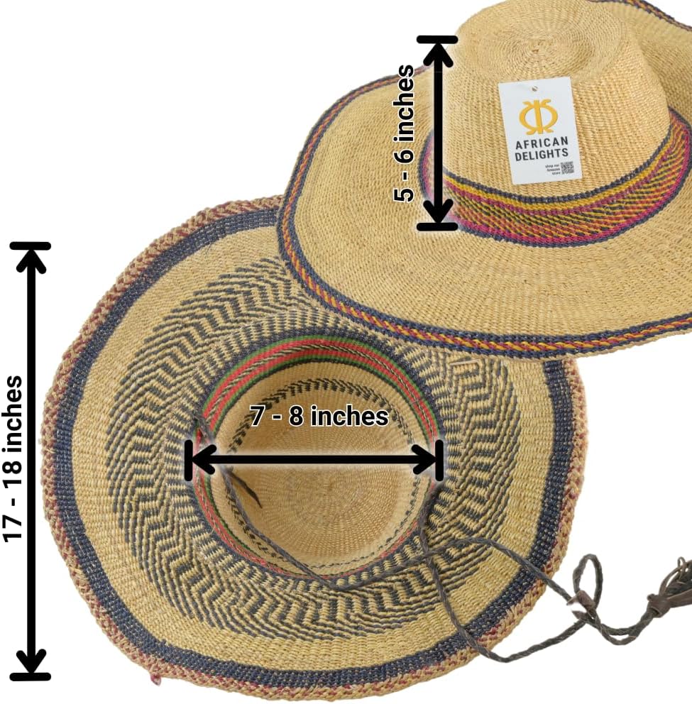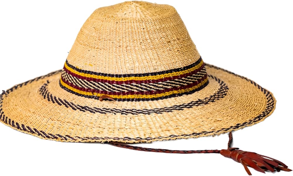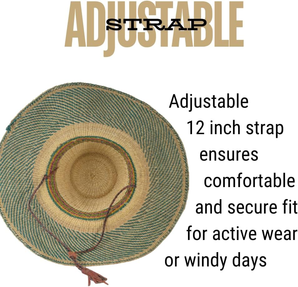 قبعة القش الأفريقية القابلة للتعديل: هذه القبعة المنسوجة يدويًا بحجم البالغين، هي قبعة ممتازة ذات عامل حماية من الشمس. يضمن الخيط القابل للتعديل ملاءمة آمنة، مما يجعلها قبعة كبيرة مثالية لأي مناسبة.