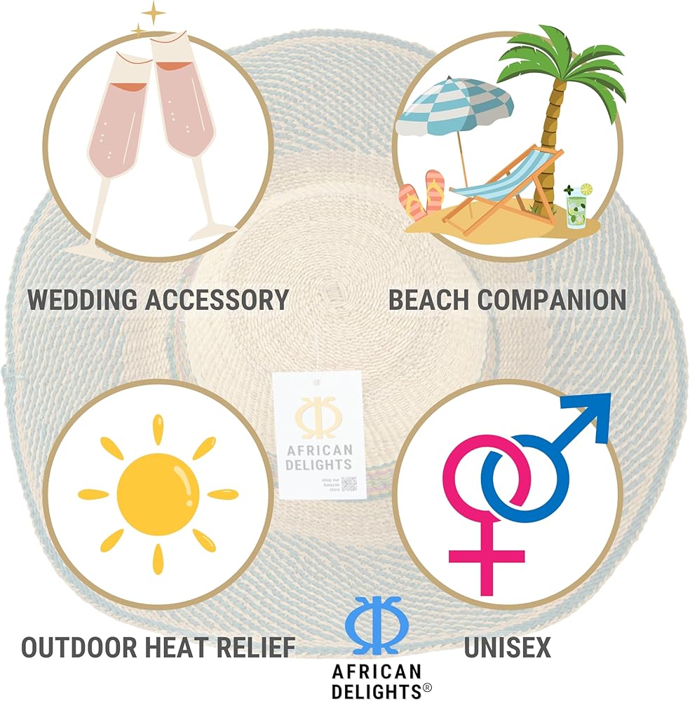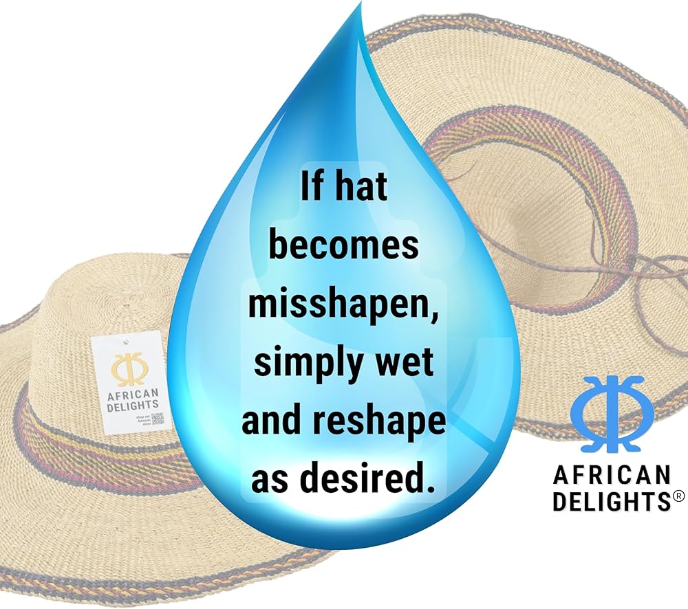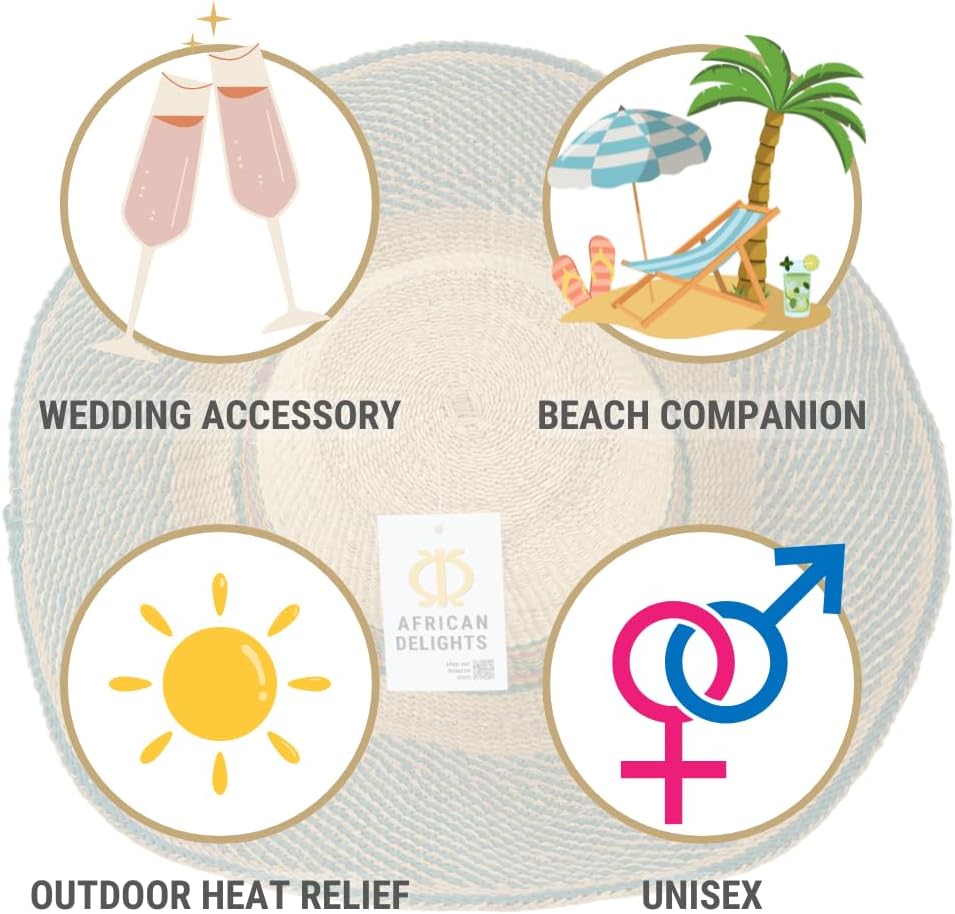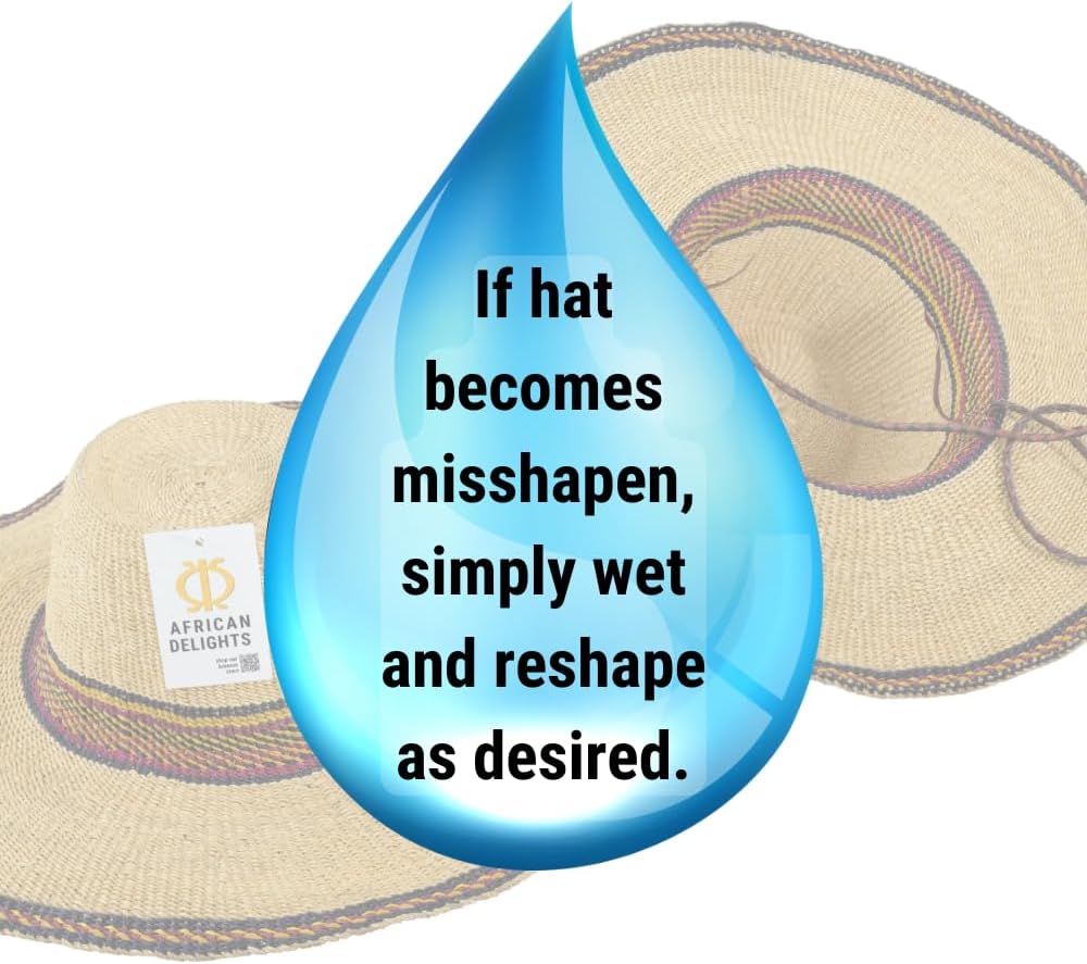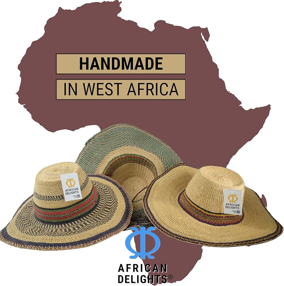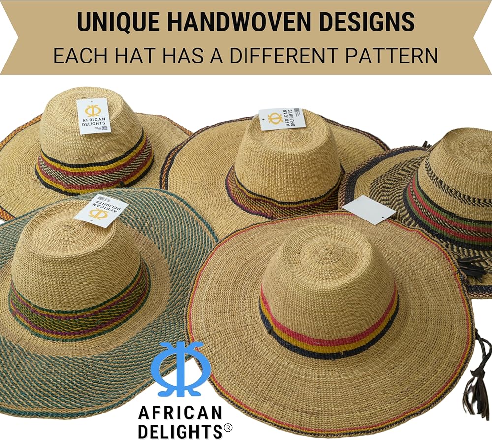 قبعة القش الأفريقية القابلة للتعديل: هذه القبعة المنسوجة يدويًا بحجم البالغين، هي قبعة ممتازة ذات عامل حماية من الشمس. يضمن الخيط القابل للتعديل ملاءمة آمنة، مما يجعلها قبعة كبيرة مثالية لأي مناسبة.