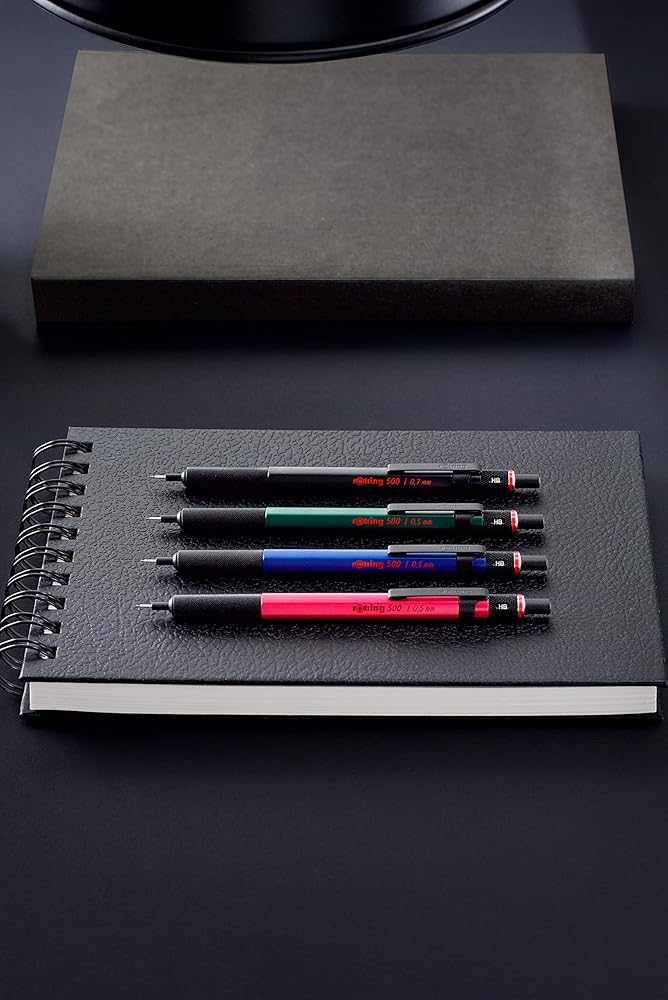 Get precise control with the rOtring 500 mechanical pencil with metal grip. This drafting pencil combines a lightweight plastic body and textured metal grip zone to provide comfort during any technical writing, sketching, or drawing task. A brass mechanism delivers precision lead advancement in the rOtring mechanical pencil, while a fixed lead guidance sleeve prevents breakage and offers an unimpeded page view for precise ruler-based drawing. Meanwhile, the hexagonal barrel ensures fatigue-free writing and drawing and prevents the tool from rolling even on inclined drafting tables. With a sleek, modern, green barrel design, the rOtring 500 stands out from other mechanical pencils. Finally, the adjustable lead hardness grade indicator lets you identify pencils quickly when working, so you always know when you have this 0.5mm mechanical pencil in hand.