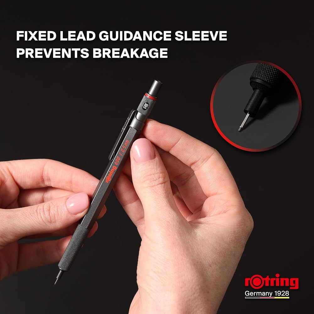 Fixed lead guidance sleeve prevents breakage and offers an unimpeded page view for precise ruler-based drawing