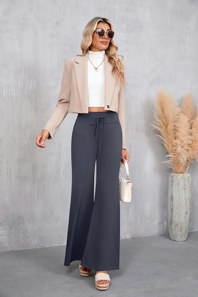 • الميزات: بنطال واسع الساق، يطيل الساقين بصريًا ويجعلك تبدو أنحف وعصريًا وأنيقًا؛ تصميم بخصر عالٍ مع رباط، وخصر قابل للتعديل، وجيوب للتخزين المريح