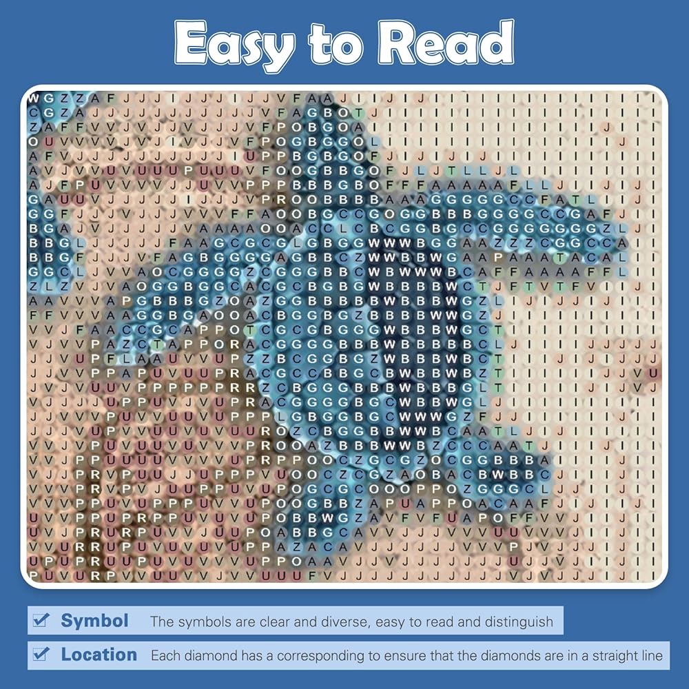 رموز سهلة القراءة - من أجل جعل عملية جعل اللوحة الفنية الماسية أكثر إثارة للاهتمام وسهولة، نستخدم رموزًا ورسومات مختلفة لتمييز مناطق الألوان المختلفة، والقماش السميك، ومناطق الرسم الأكبر، لذلك يسهل على البالغين والمبتدئين فهمها. ابدأ