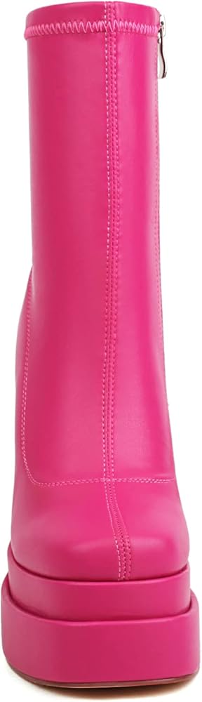 Chelsea style mid calf go go boots feature a popular double waterproof platform with square toe design, side zipper make these boots easy to wear without damaging them.