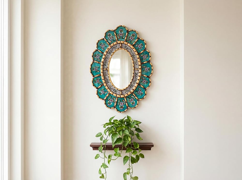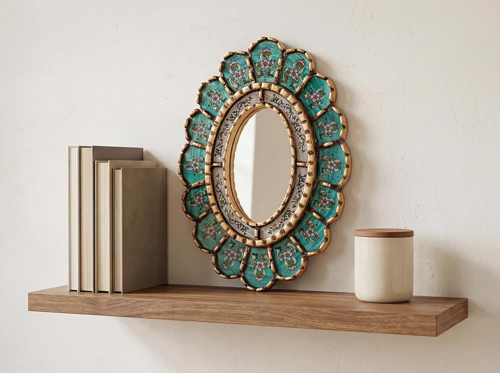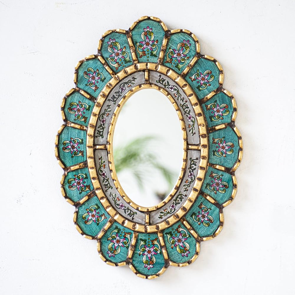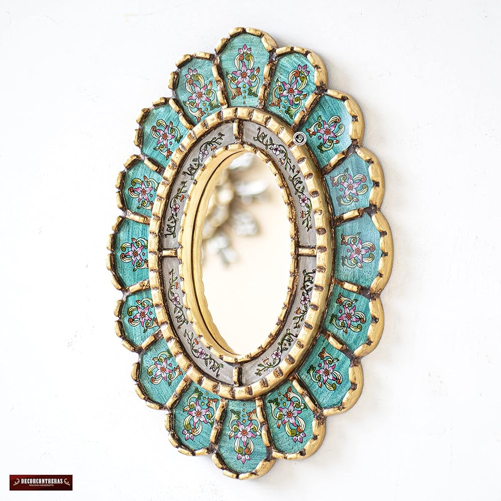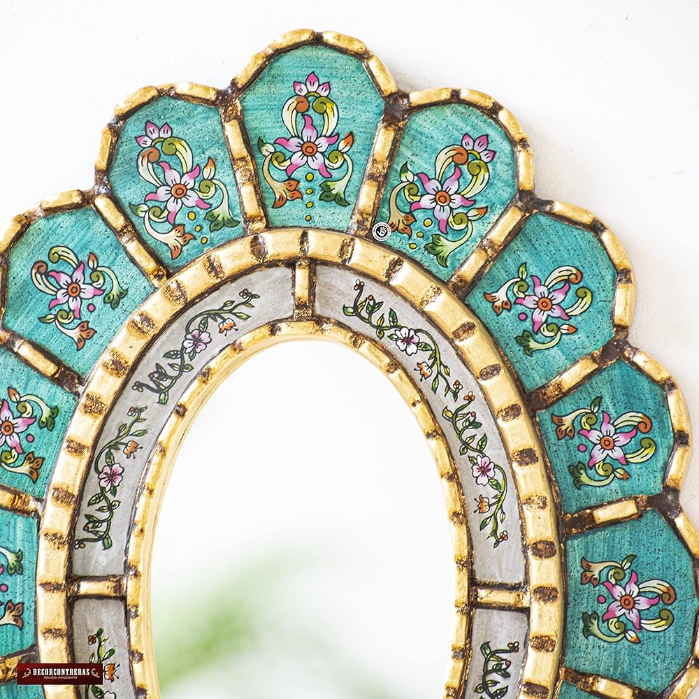 Beautifully handcrafted in Peru. This mirror oval ”cuscaja” is created entirely by hand using the reverse painted glass style. Glass panels completely cover the oval design, also is a great way to bounce natural light around a room. Combining a oval-shaped silhouette with a gold leaf finished wood frame. Handmade mirror is a perfect gift for mothers, mom, or a birthday gifts for best friend and an ideal and unique accent piece for the home décor, office decor or farmhouse decor. Measures 15.4"H x 11" W x 1.18" D