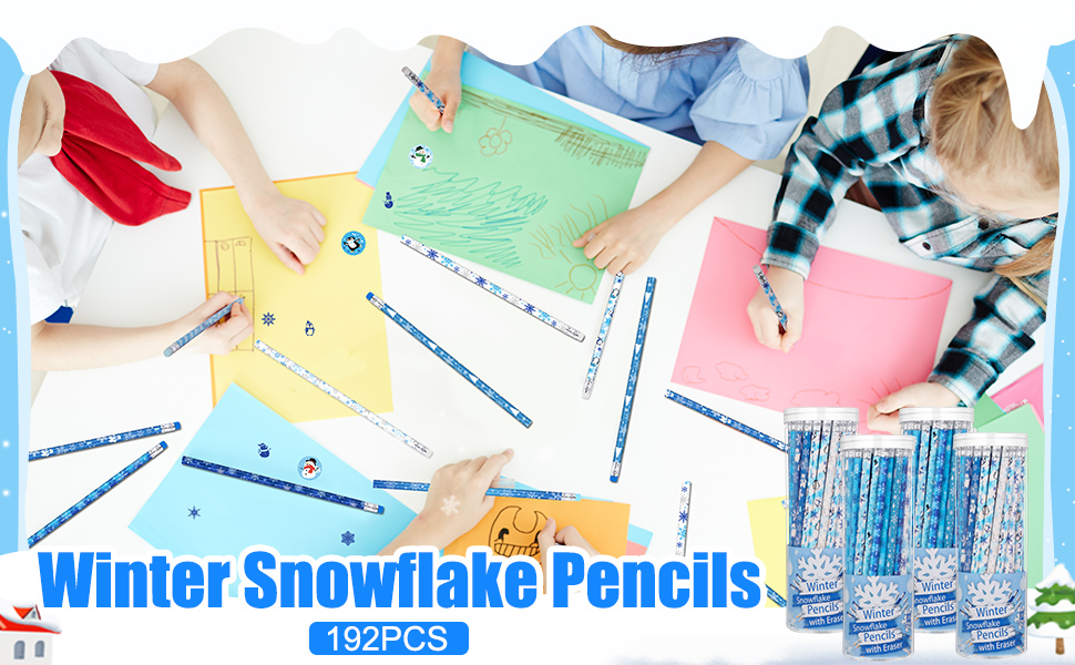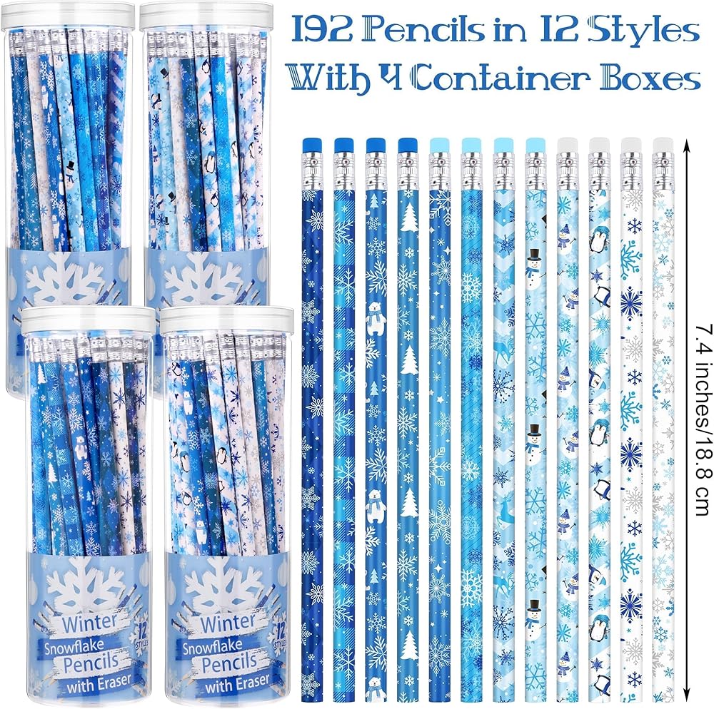 192 قطعة من أقلام الرصاص على شكل ندفة الثلج الشتوية مع ممحاة، هدايا عيد الميلاد، أقلام رصاص ممتعة للعطلات مع صندوق تخزين، أقلام رصاص HB، هدايا الحفلات المجمدة، لوازم مكافآت الحفلات والقرطاسية المدرسية