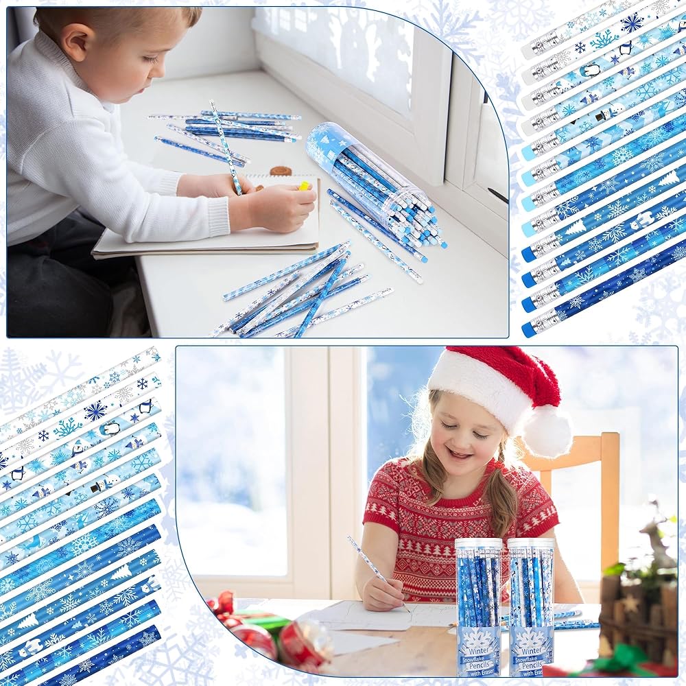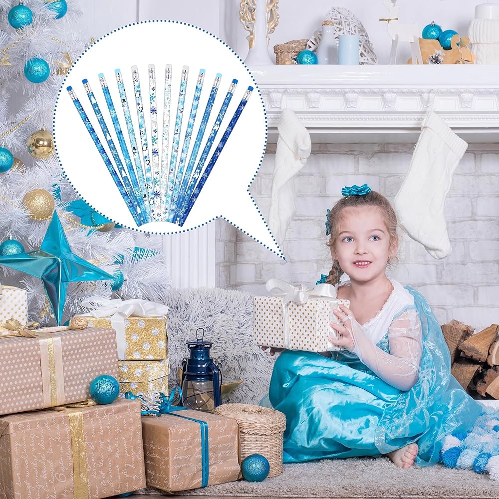 تصميم رائع: تتميز أقلام الرصاص الخاصة بنا ذات الطابع الشتوي بـ 12 تصميمًا مختلفًا في نظام ألوان كلاسيكي باللونين الأزرق والأبيض، مزينة برسوم توضيحية مثل ندفات الثلج ورجال الثلج وطيور البطريق وأشجار الصنوبر، غنية بالألوان والتصميم.