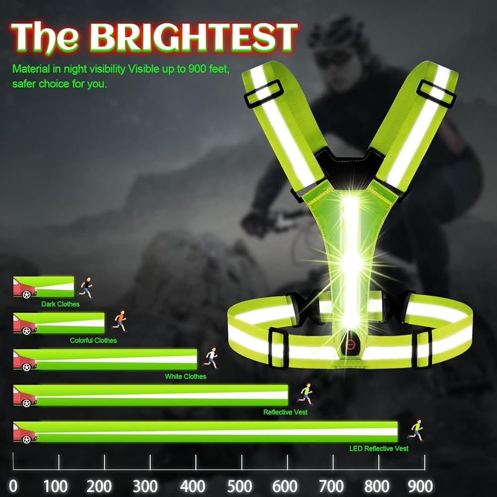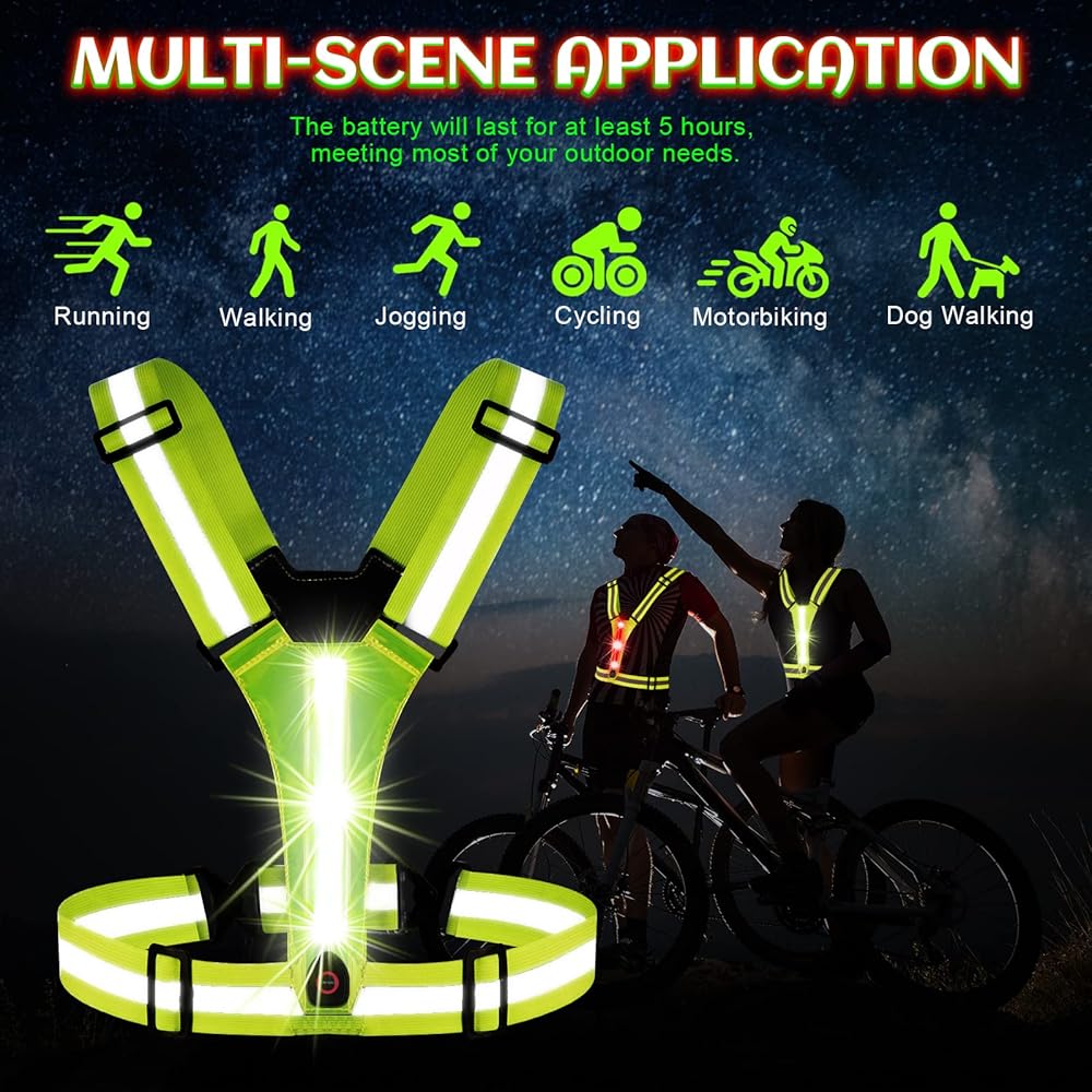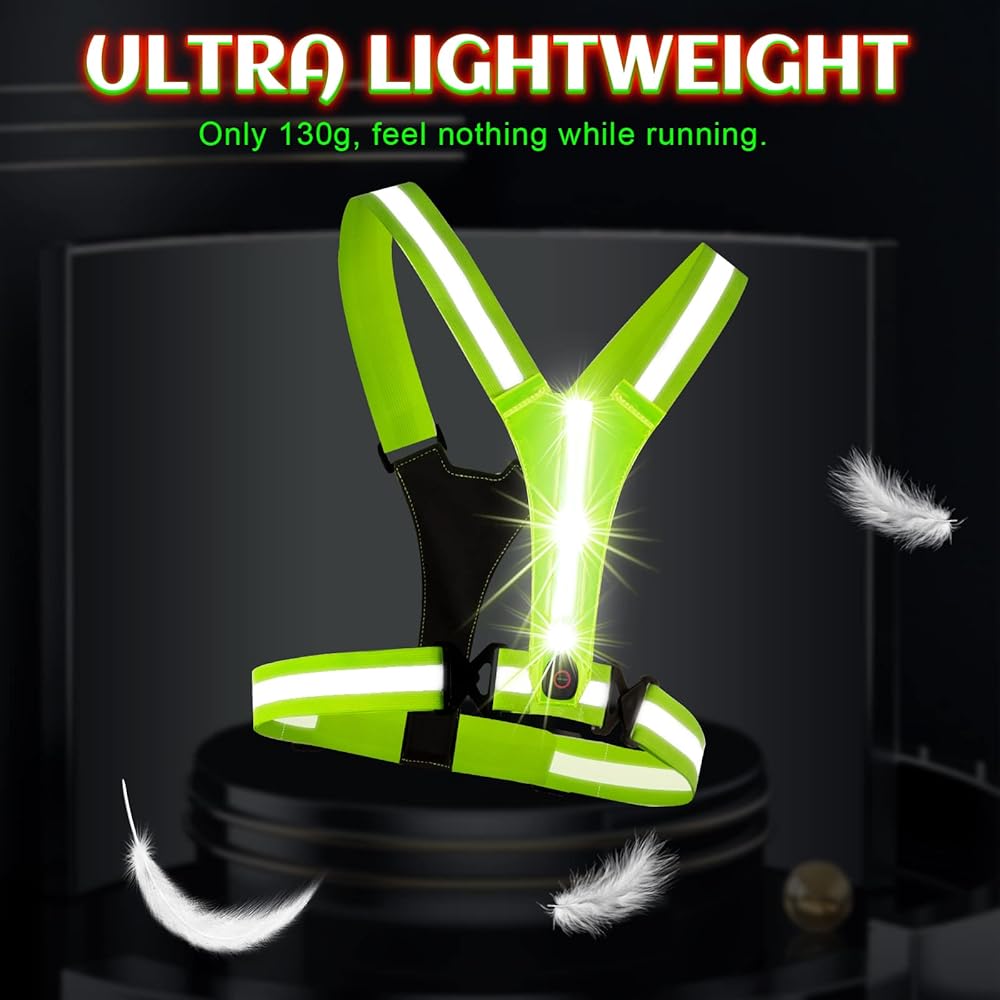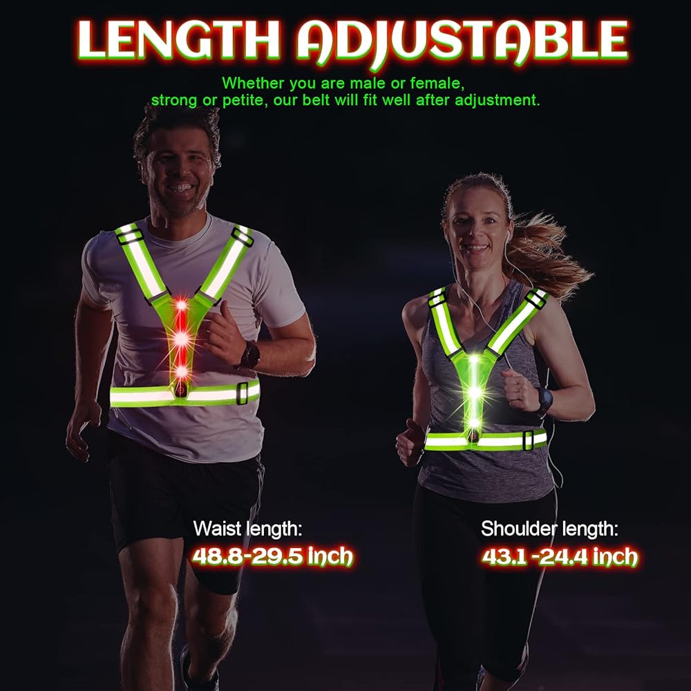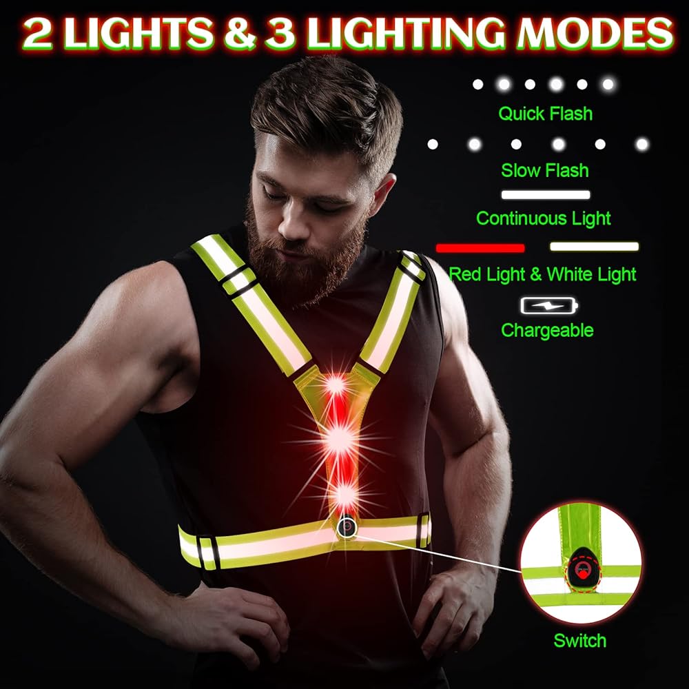 • سترة LED وعاكسة للضوء: تمت ترقيتها حديثًا، والمفتاح ومنفذ الشحن واضحان. بالإضافة إلى المادة العاكسة عالية الجودة، توفر سترة الجري المضيئة هذه رؤية بحد أقصى 800 قدم مع أضواء خضراء وحمراء في الأمام والخلف، ويمكنك ضبط وضع وميض الضوء بحرية.