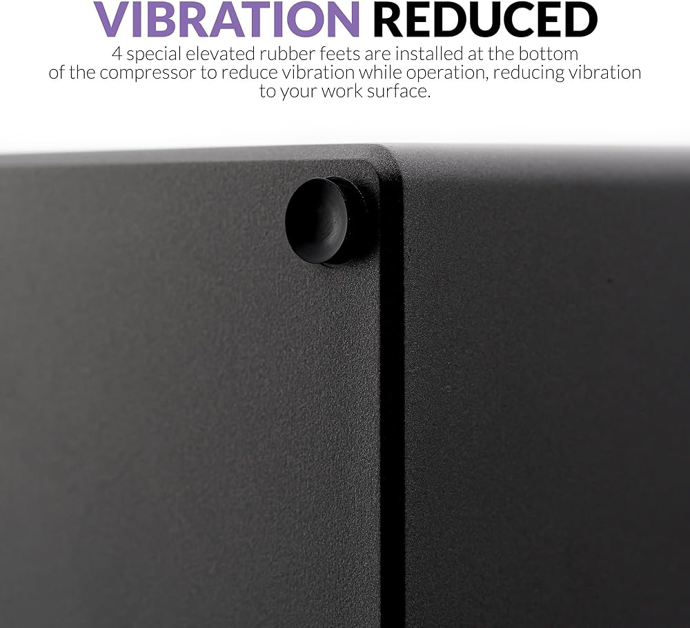 تقليل الاهتزاز: مزود بأربعة أقدام مطاطية مرتفعة خاصة، يعمل الضاغط على تقليل الاهتزاز، مما يضمن بقاء مساحة العمل لديك ثابتة وغير مزعجة أثناء التشغيل. يعمل ضاغط Serenair Mini بقوة 35 ديسيبل فقط، وقد تم تصميمه لتقليل الضوضاء إلى الحد الأدنى، مما يسمح لك بالعمل في بيئة هادئة ومريحة.
