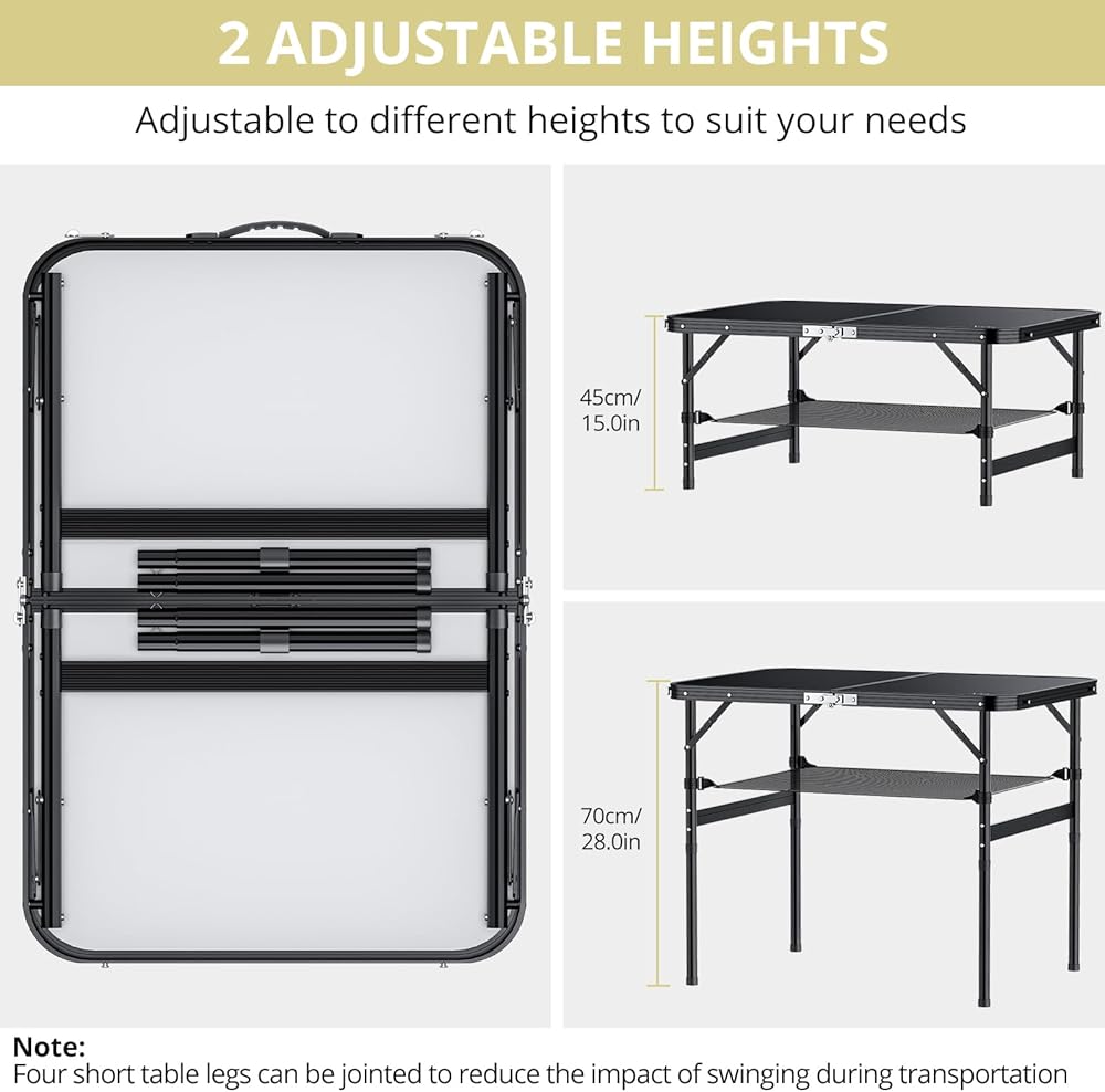 ارتفاعان قابلان للتعديل يمكن تعديل طاولة التخييم هذه إلى ارتفاع مريح يبلغ 15 انش أو 28 انش. يمكنك ضبط ارتفاع الطاولة وفقًا للمناسبات المختلفة: النزهة / الشواء في الهواء الطلق / غرفة الطعام / القهوة / التخييم / عناصر المعرض وما إلى ذلك.